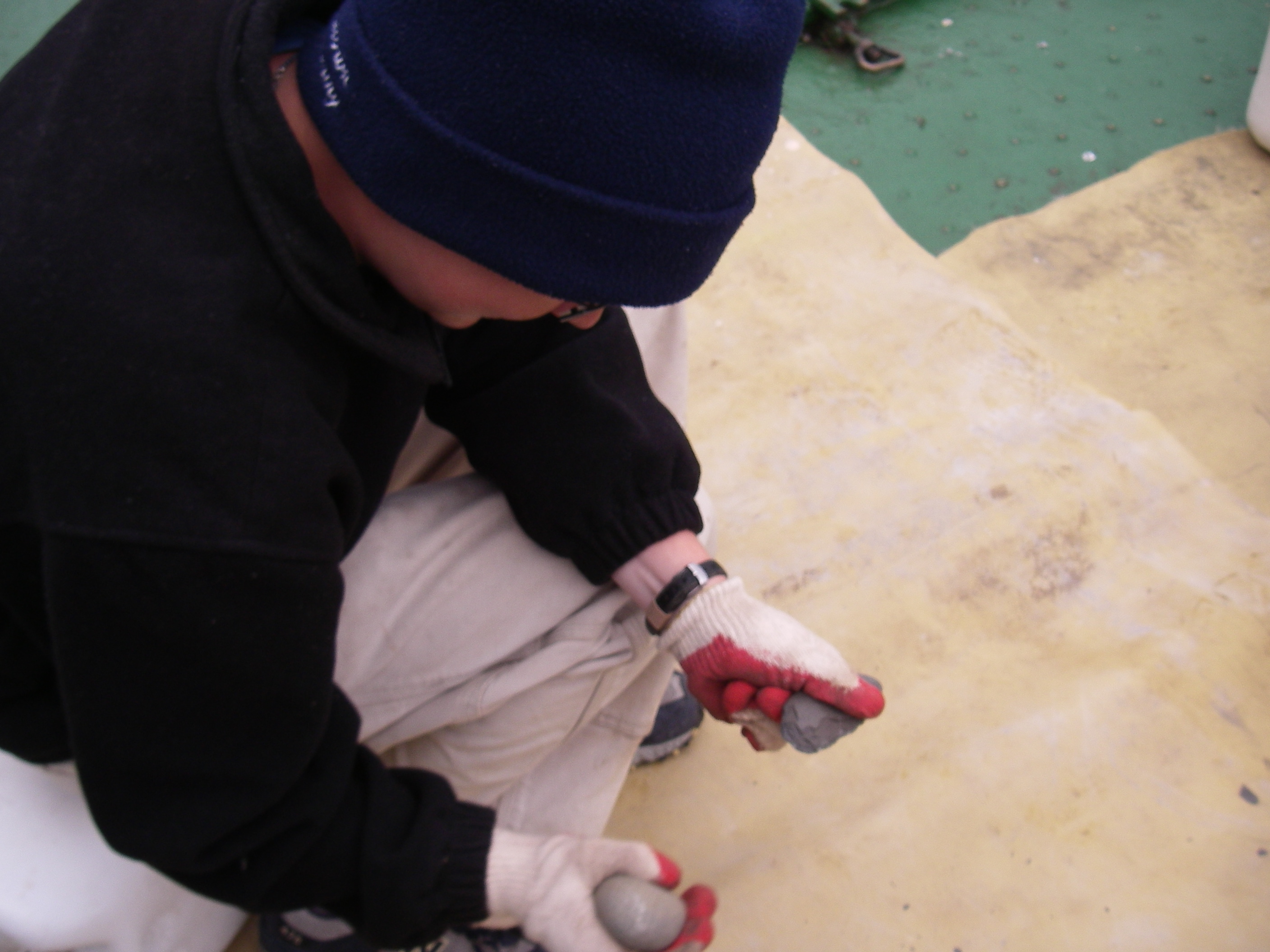 Bre MacInnnes practicing flint knapping during some down time aboard the Gipanis.