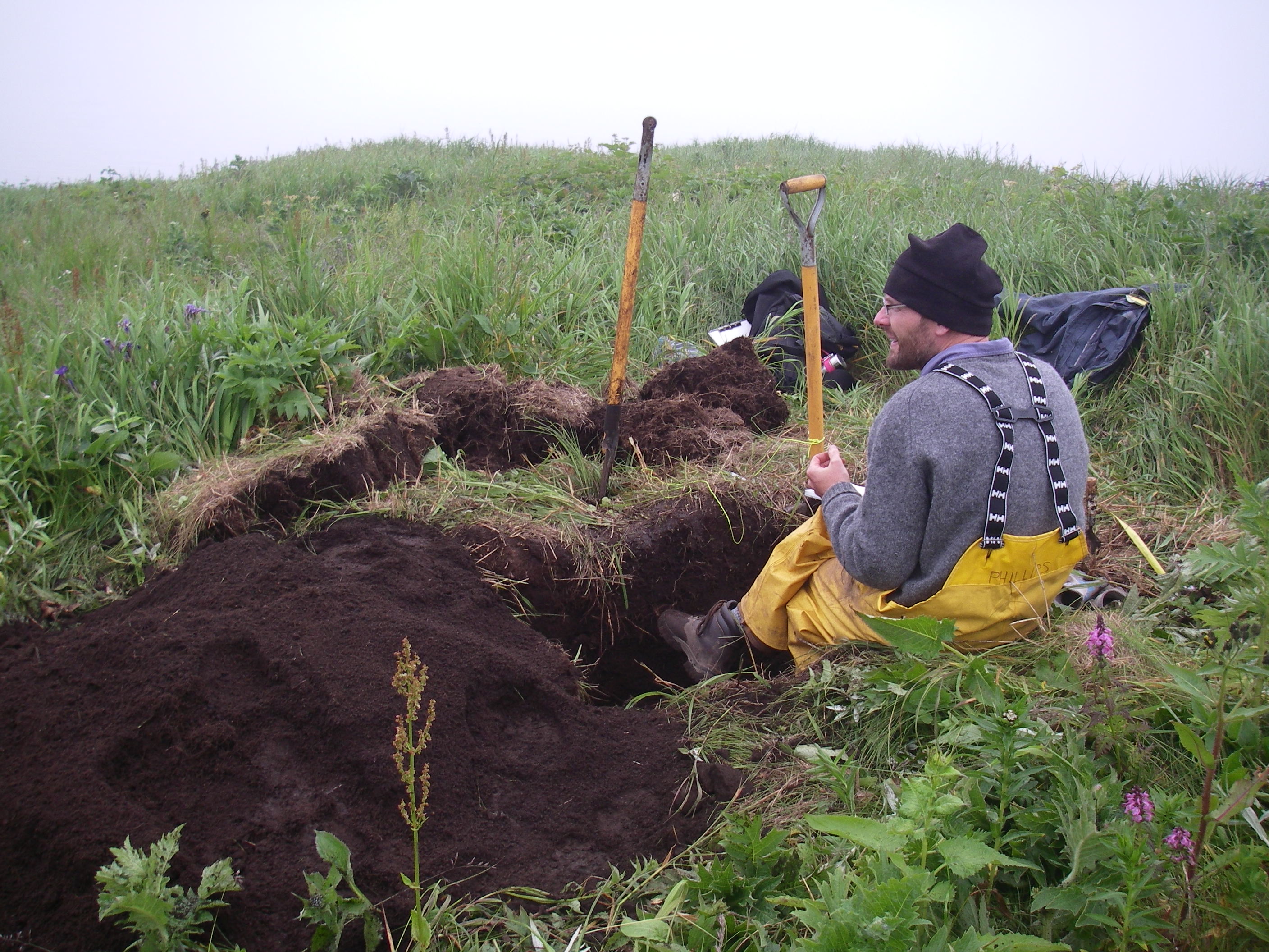 Colby Phillips takes a break from digging an archaeological test pit at Vodopadnaya, Simushir, Russia.