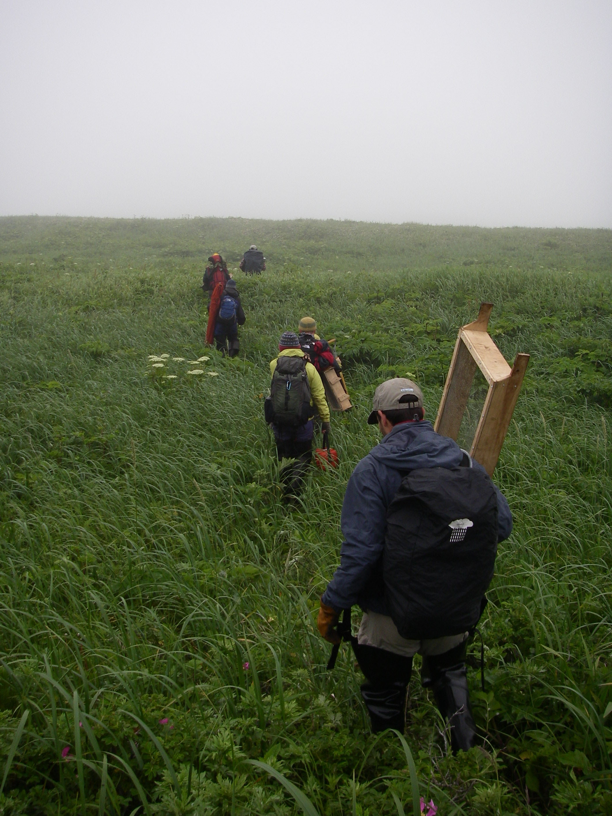 Kuril Biocomplexity Project group members hiking through the long grass at Lovtsova, Russia.