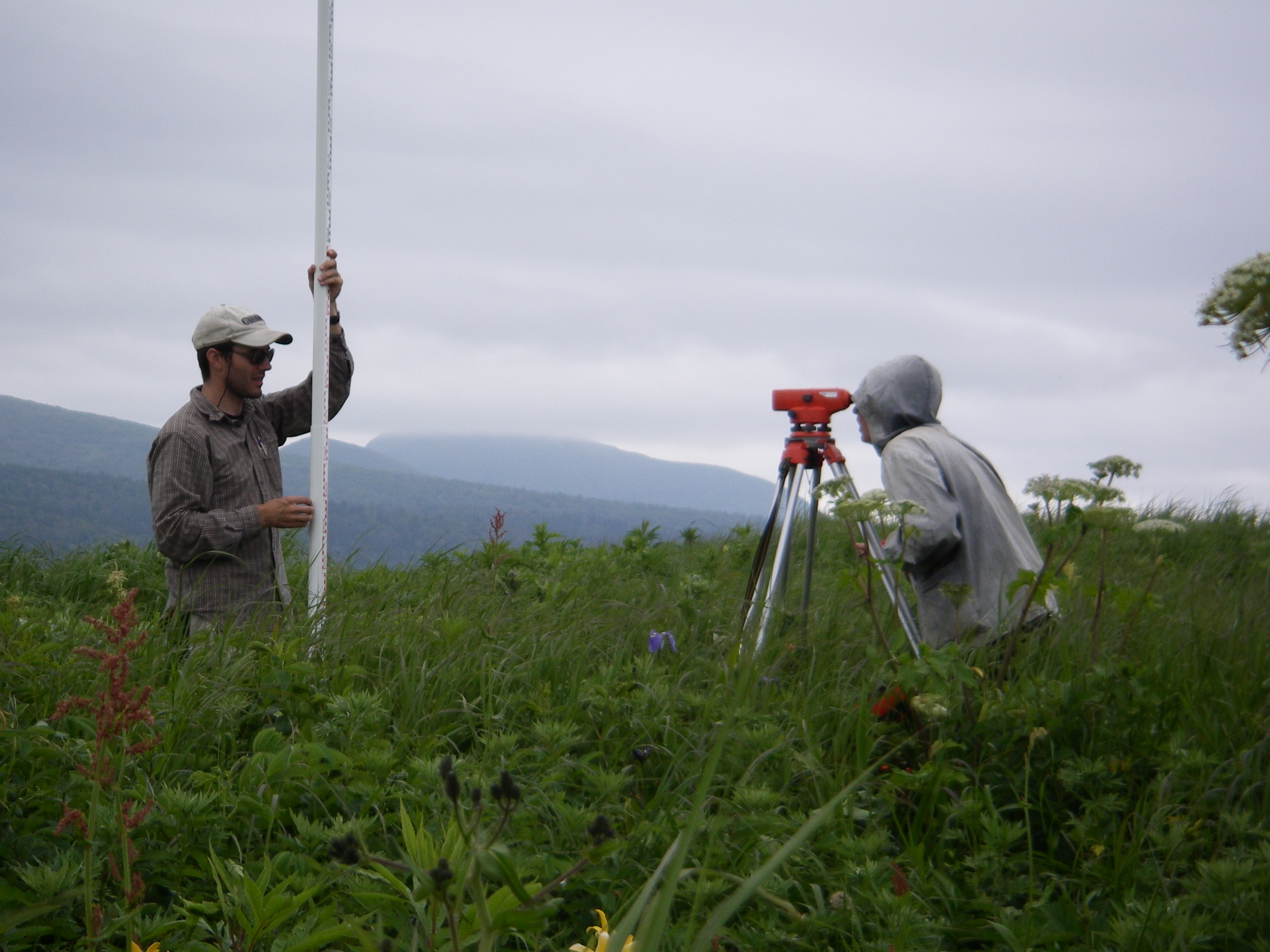 Jesse Einhorn (L) and Bre MacInnes (R) work on a topographic profile using the navaleer, which is used to measure elevation and distance.
