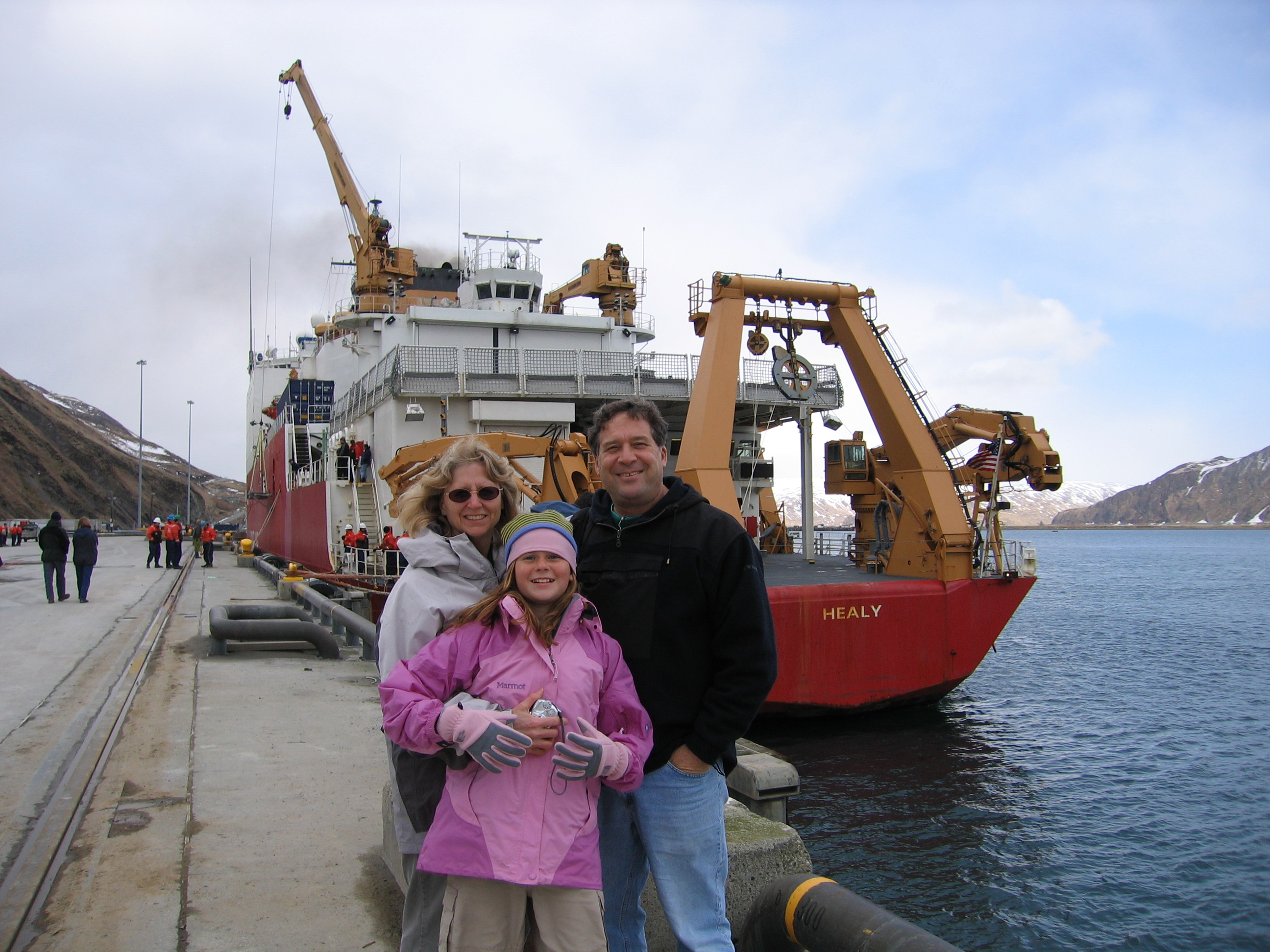 Jackie Grebmeier (left), Ruth Cooper (center), Lee Cooper (right) with the USCGC Healy in the background, Dutch Harbor, AK.