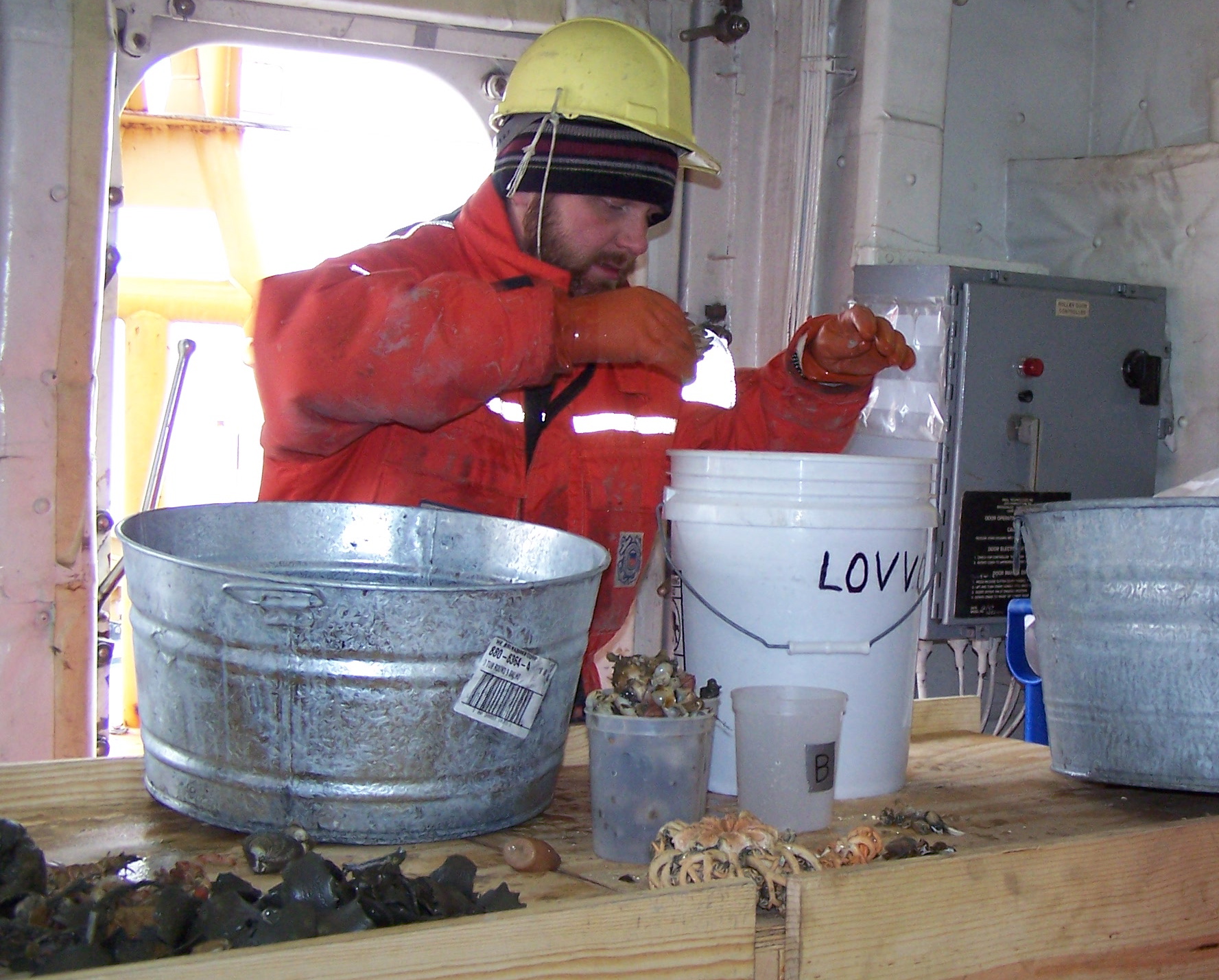 Jason Kolts sorts through the trawl catch on the USCG Healy icebreaker.