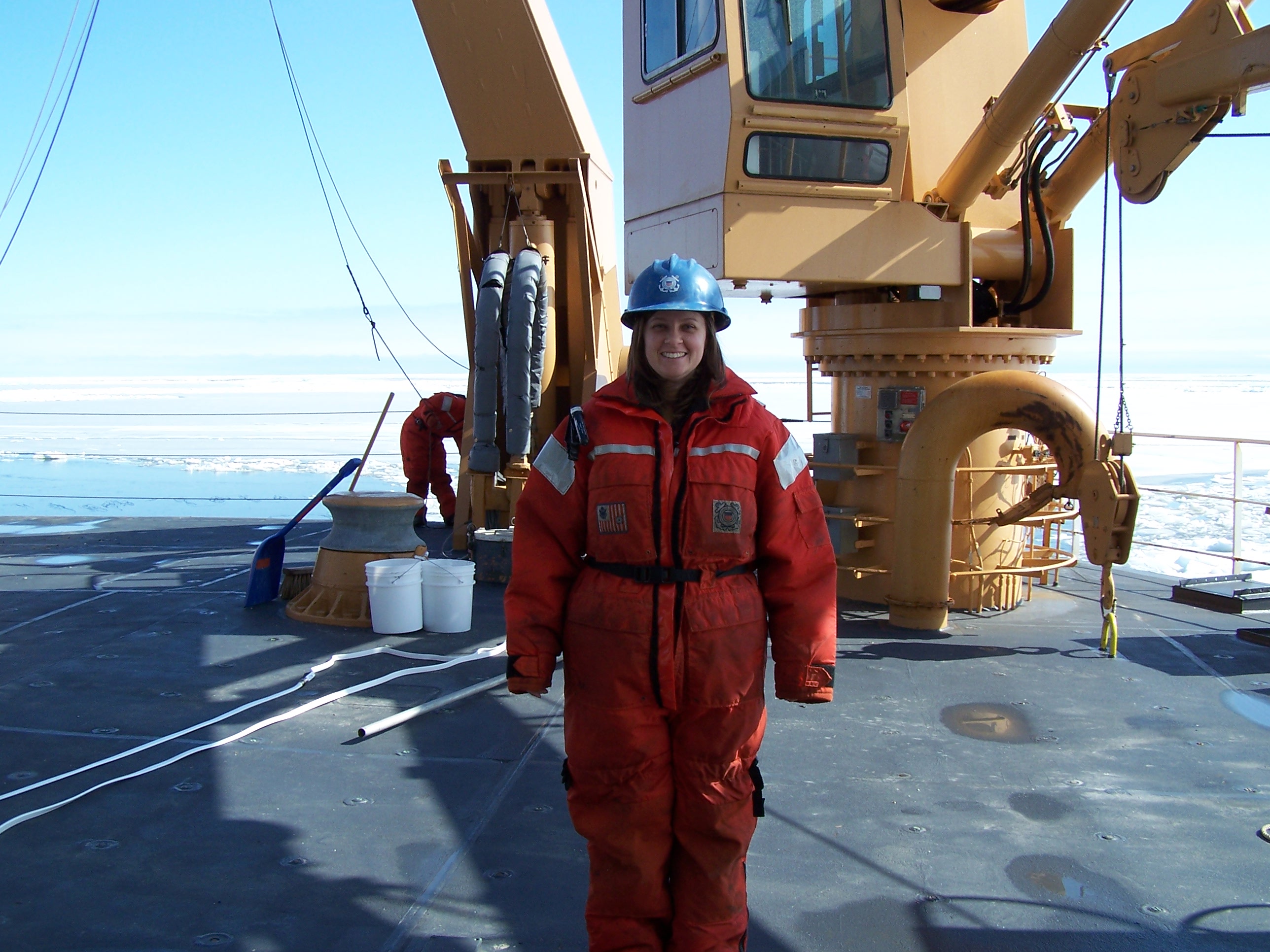TREC teacher Samantha Barlow in a survival suit on the deck of the USCG Healy icebreaker.