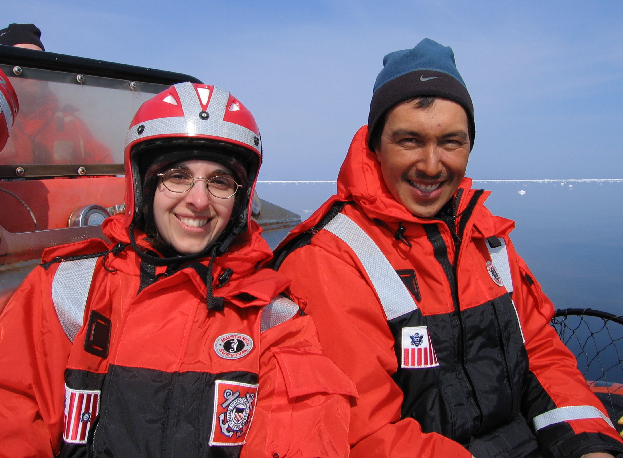 Patty Janes and Perry Pungawi onboard a rigid inflatable hull in the Bering Sea.