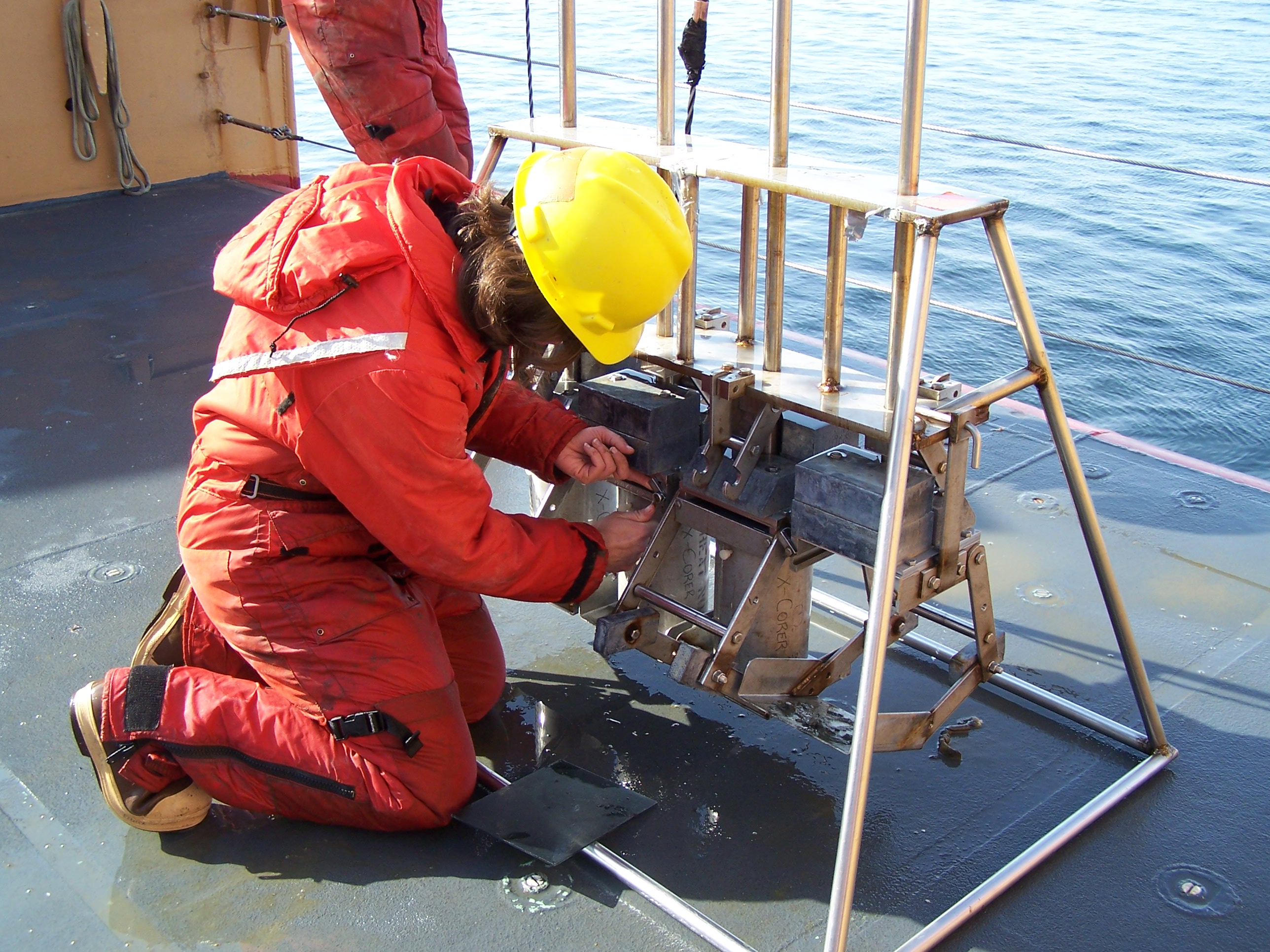 Rebecca Pirtle-Levy works on the back deck of the USCG Healy icebreaker with the HAPS core.