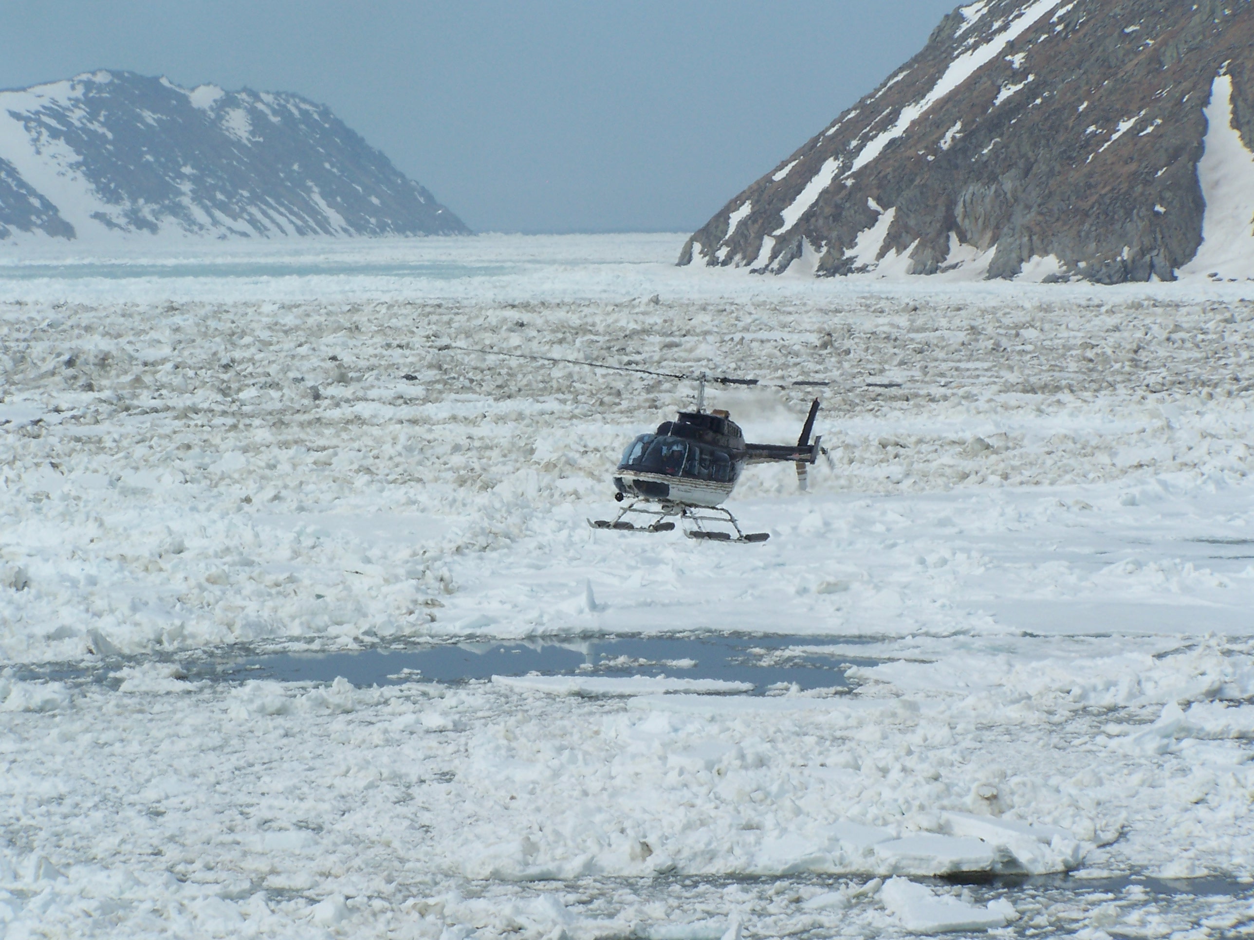 Helicopter comes in to land on the USCG Healy icebreaker after visiting Little Diomede Island, U.S.