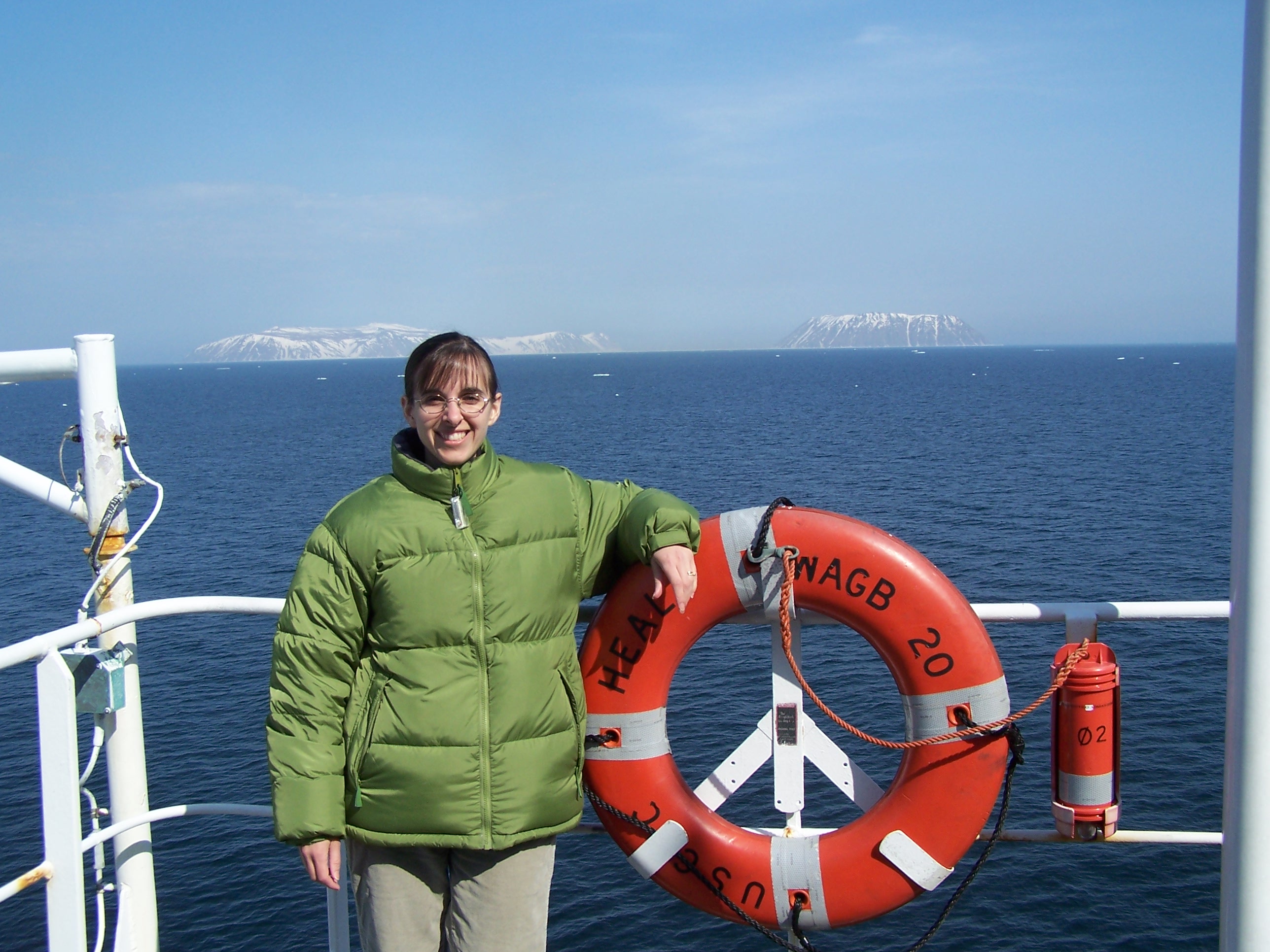 Patty Janes poses in front of Big Diomeded, Russia (left), and Little Diomede, U.S. (right).