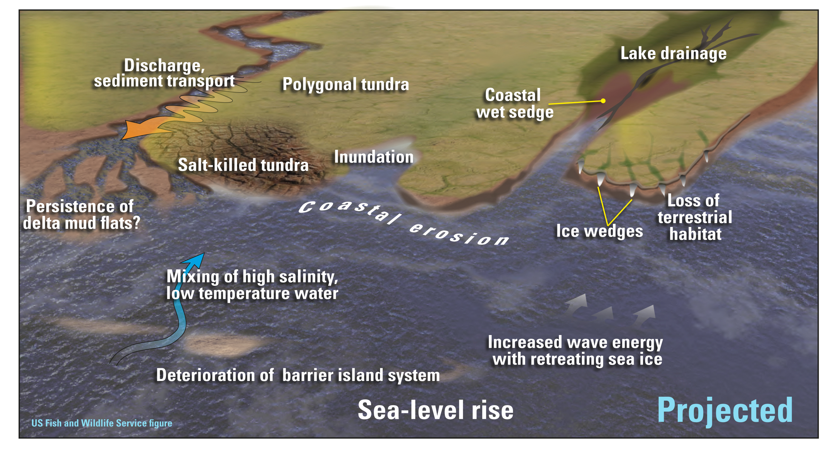 Schematic of the projected arctic coastline landscape, illustrating elements that may change over the next century as a result of climate warming.