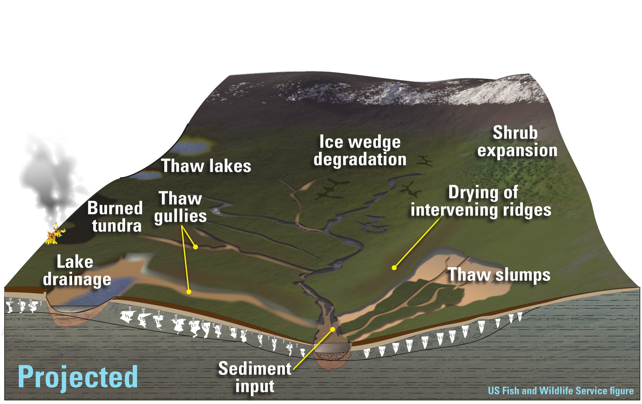 Schematic of the projected arctic foothills landscape, illustrating elements that may change over the next century as a result of climate warming.