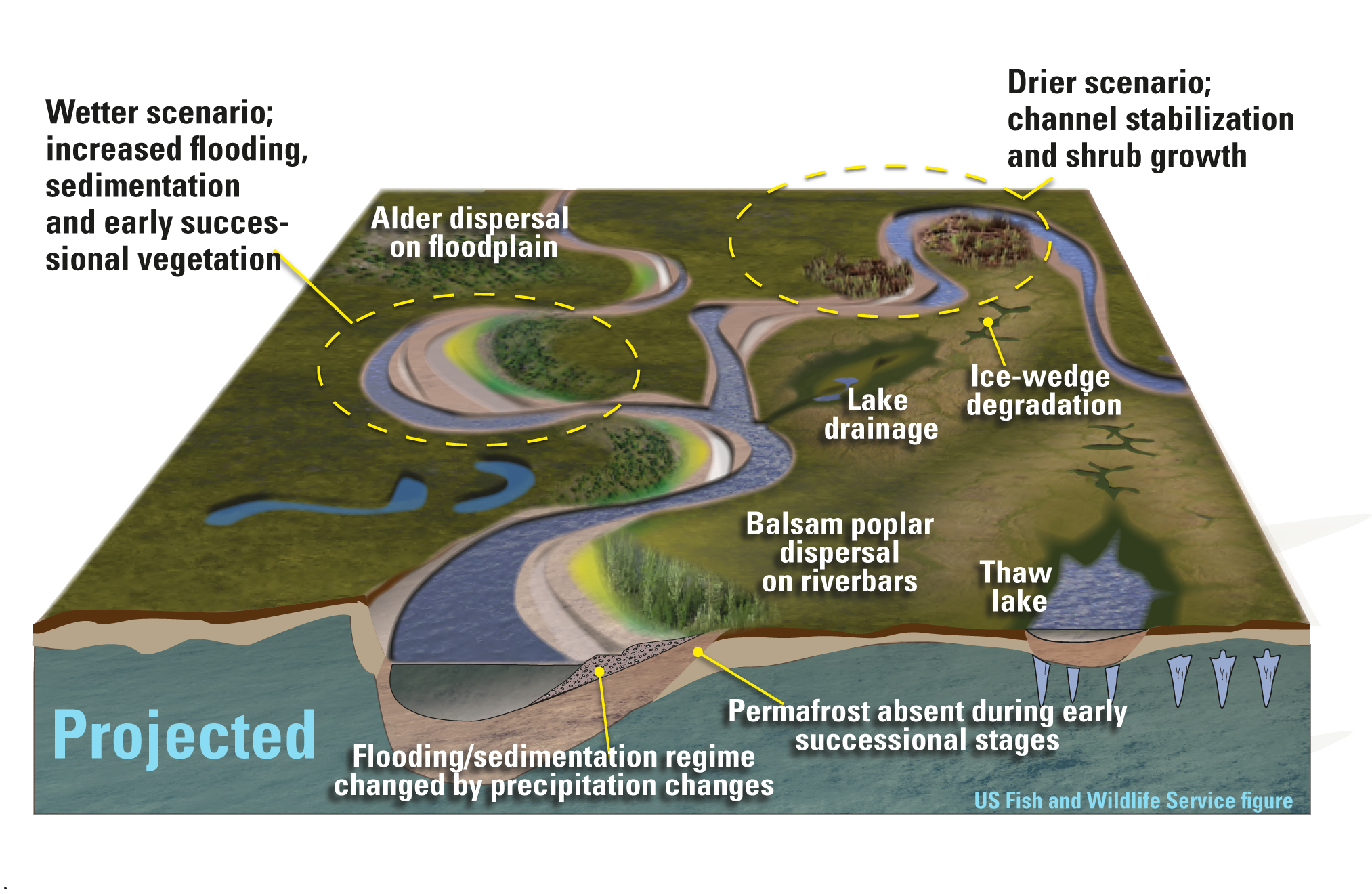 Schematic of the projected arctic floodplain landscape, illustrating elements that may change over the next century as a result of climate warming.
