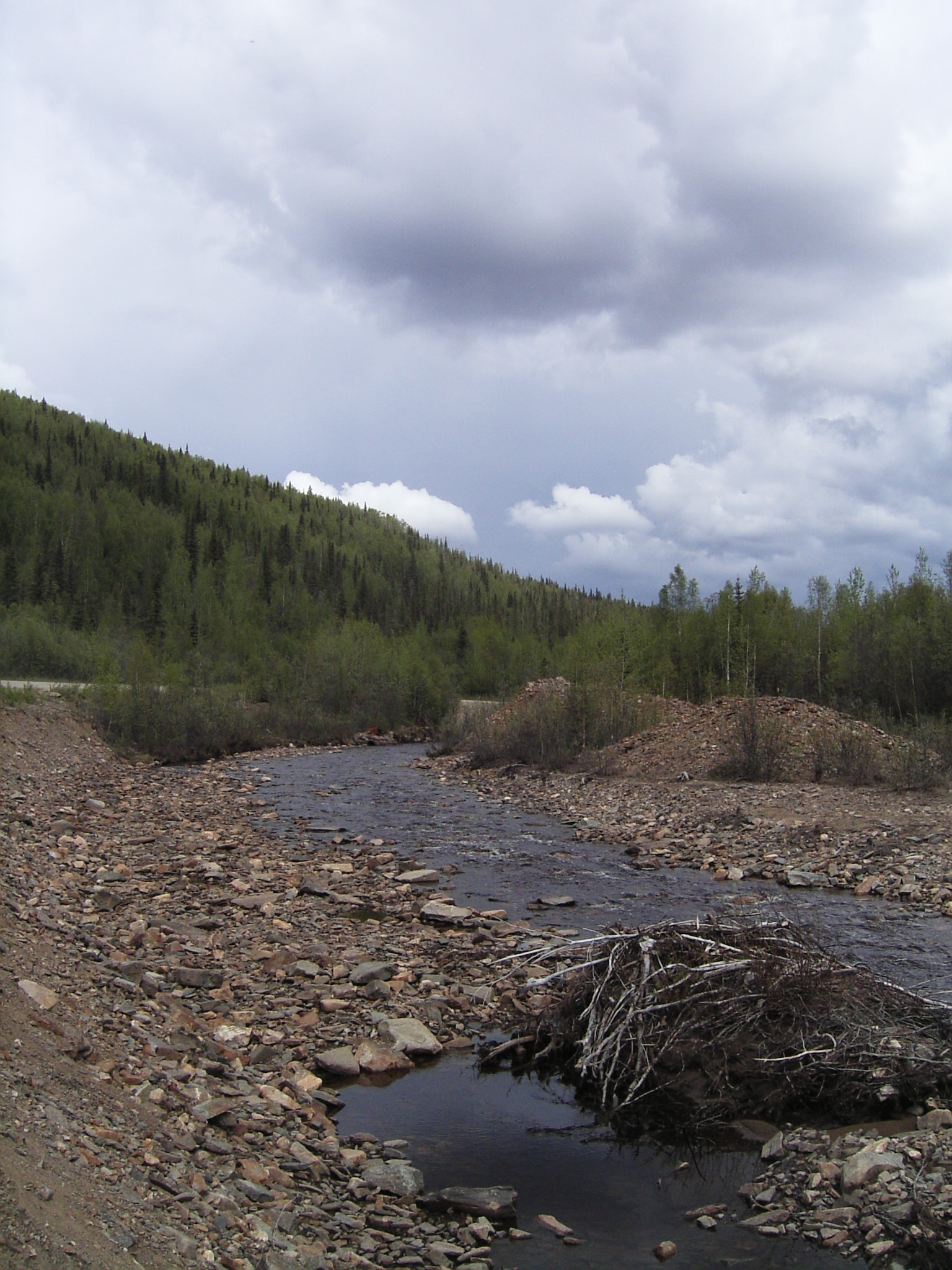 A small beaver dam built in a river near the Alaska side of the Taylor Highway (Top Of The World Highway).
