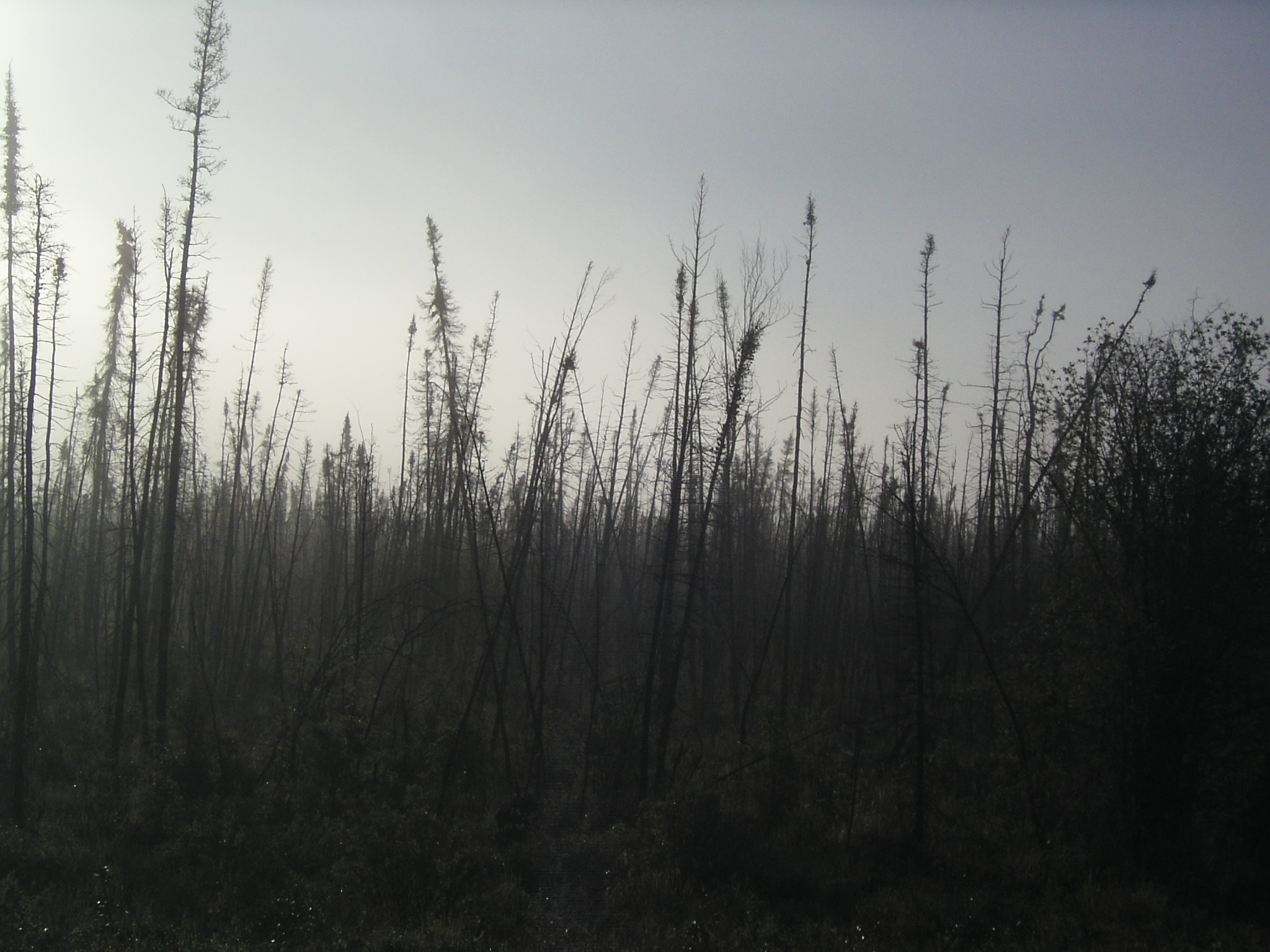A picture of the smoke filled trees along the Alaskan Highway on the way to Canada.