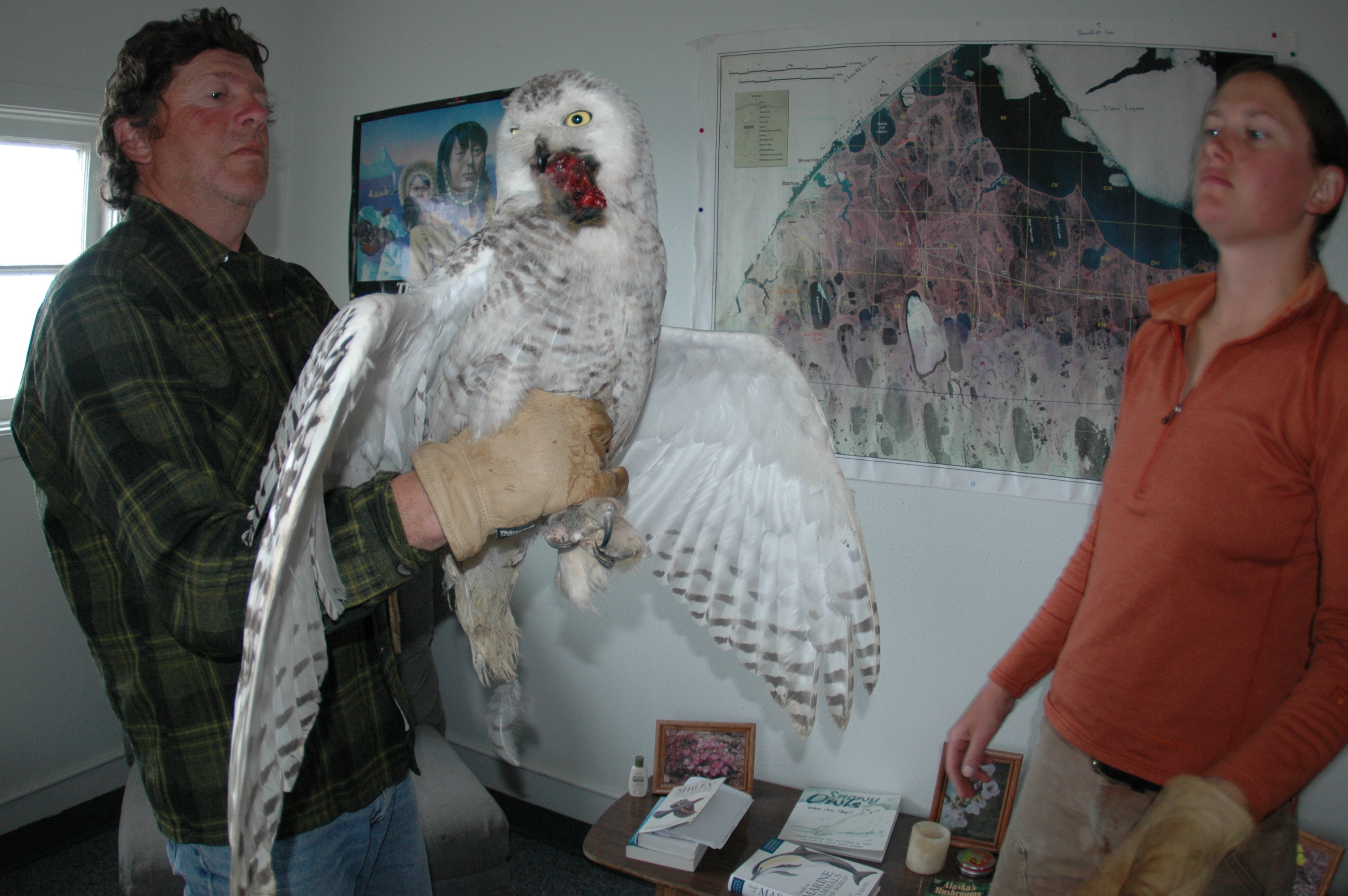 This is a good sign, the Snowy Owl is hungry and ate quite a few lemmings before she was released. In the NARL huts in Barrow, Alaska.