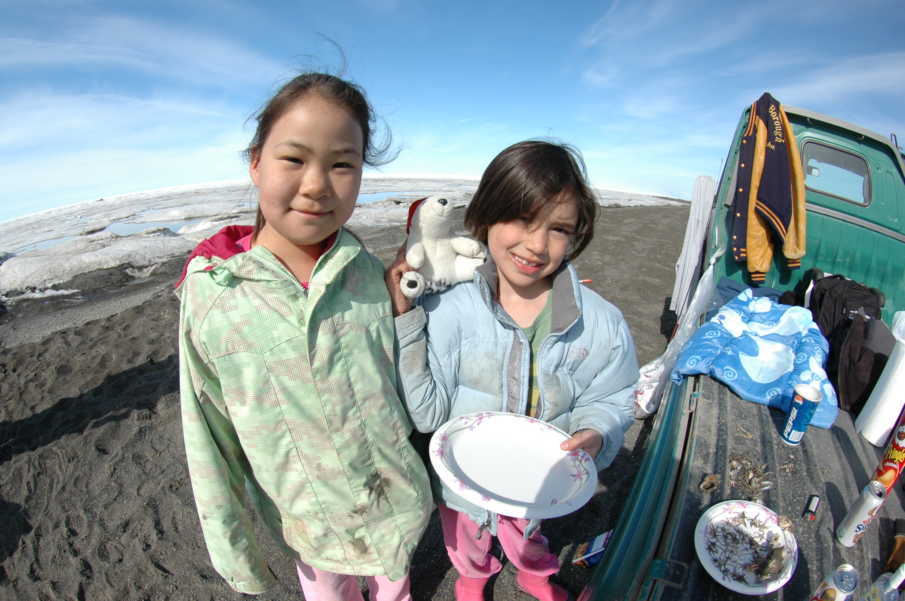 Second grader Cydnee, and third grader Noreen, take a photo with the St. Mark third grade polar bear. On the beach in Barrow, Alaska.