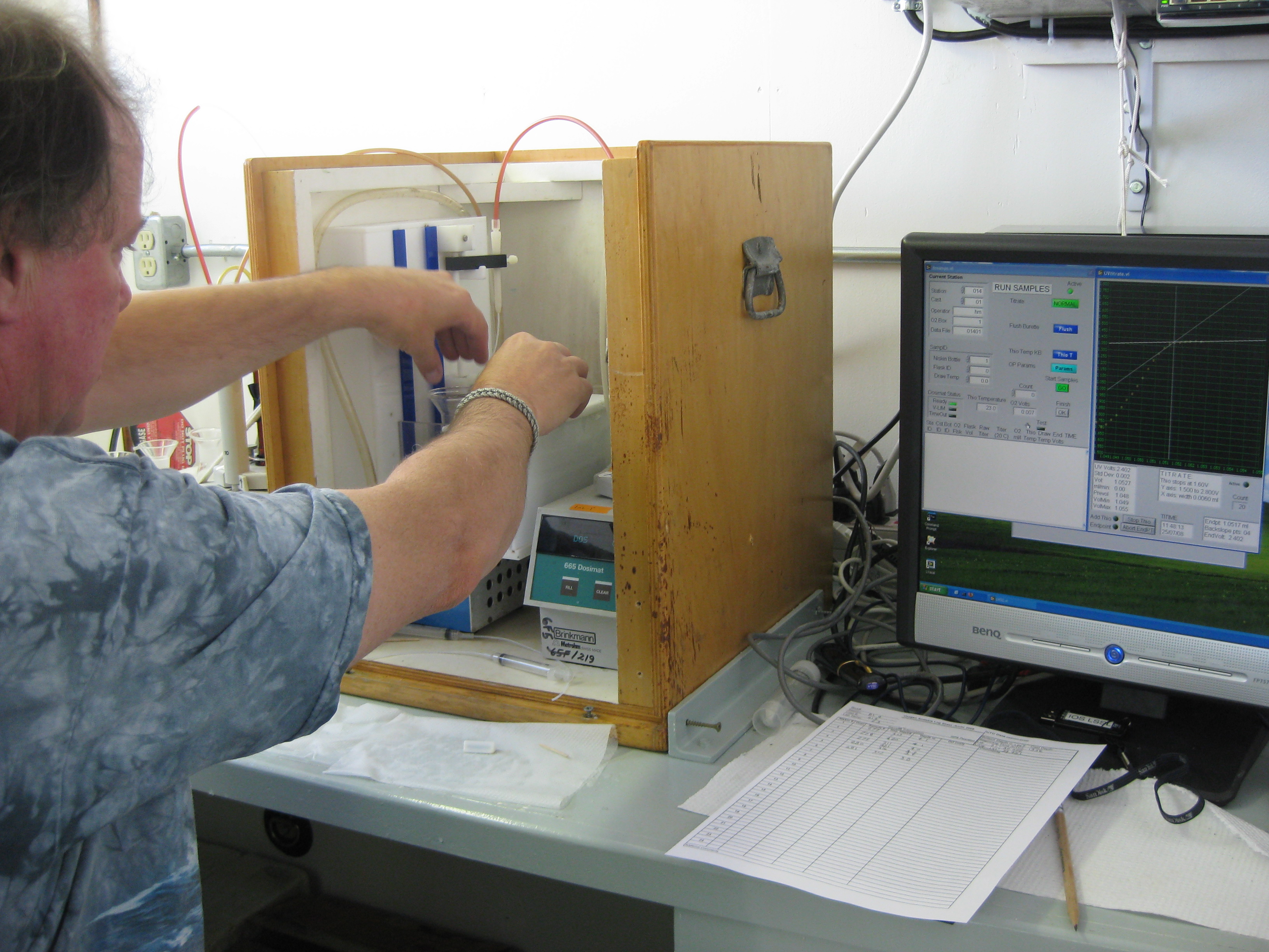 Hugh runs his samples on the "Winkler," an oxygen titration machine. He adds iodine, then measures the amount of oxidation as a measure of oxygen concentration. In the science lab, aboard the Canadian Coast Guard icebreaker Louis S. St-Laurent, on the Beaufort Sea.