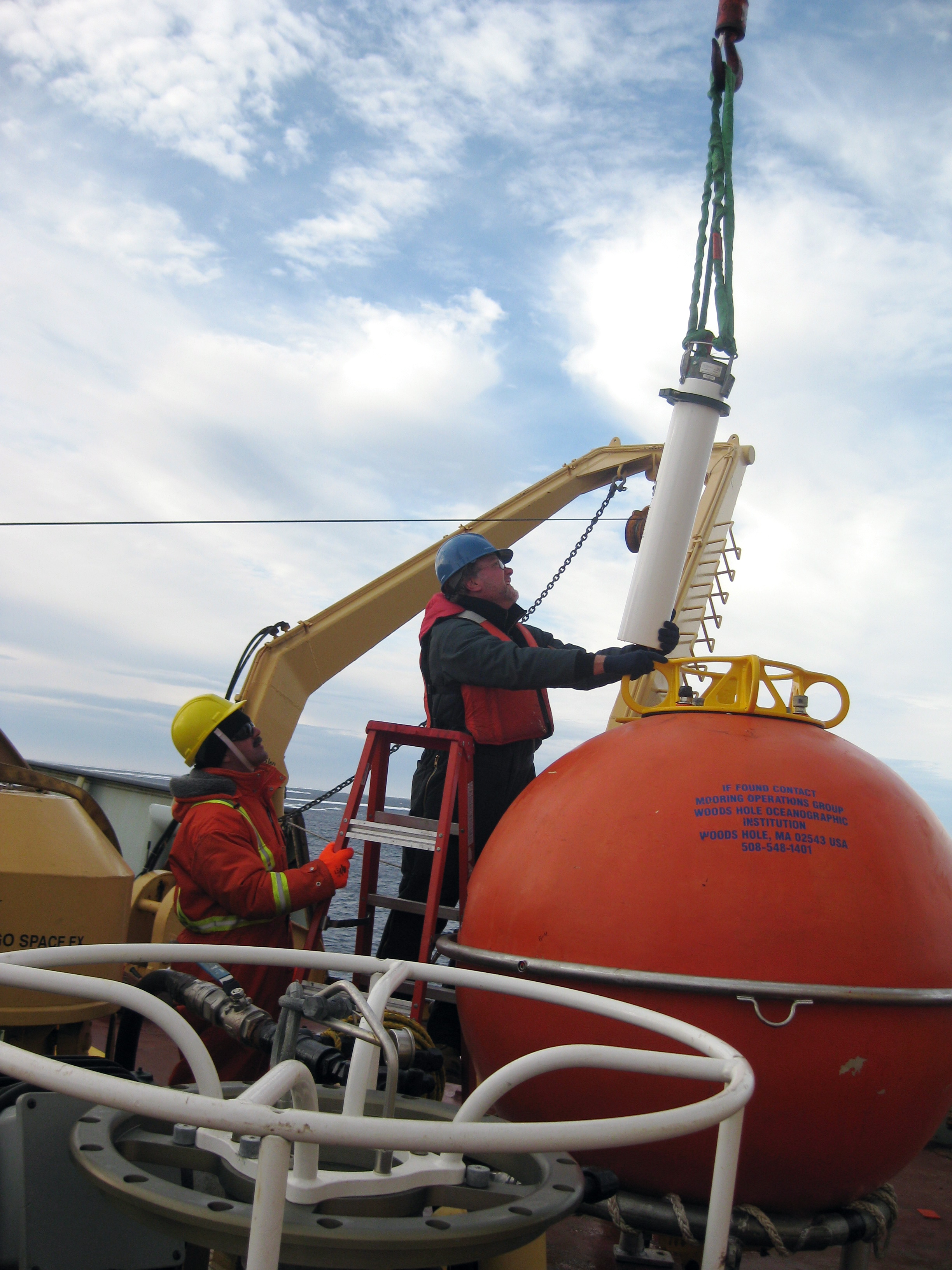 Once the mooring is on board, Rick removes the upward-looking sonar, which collects data on ice thickness. Aboard the Canadian Coast Guard icebreaker Louis S. St-Laurent, on the Beaufort Sea.