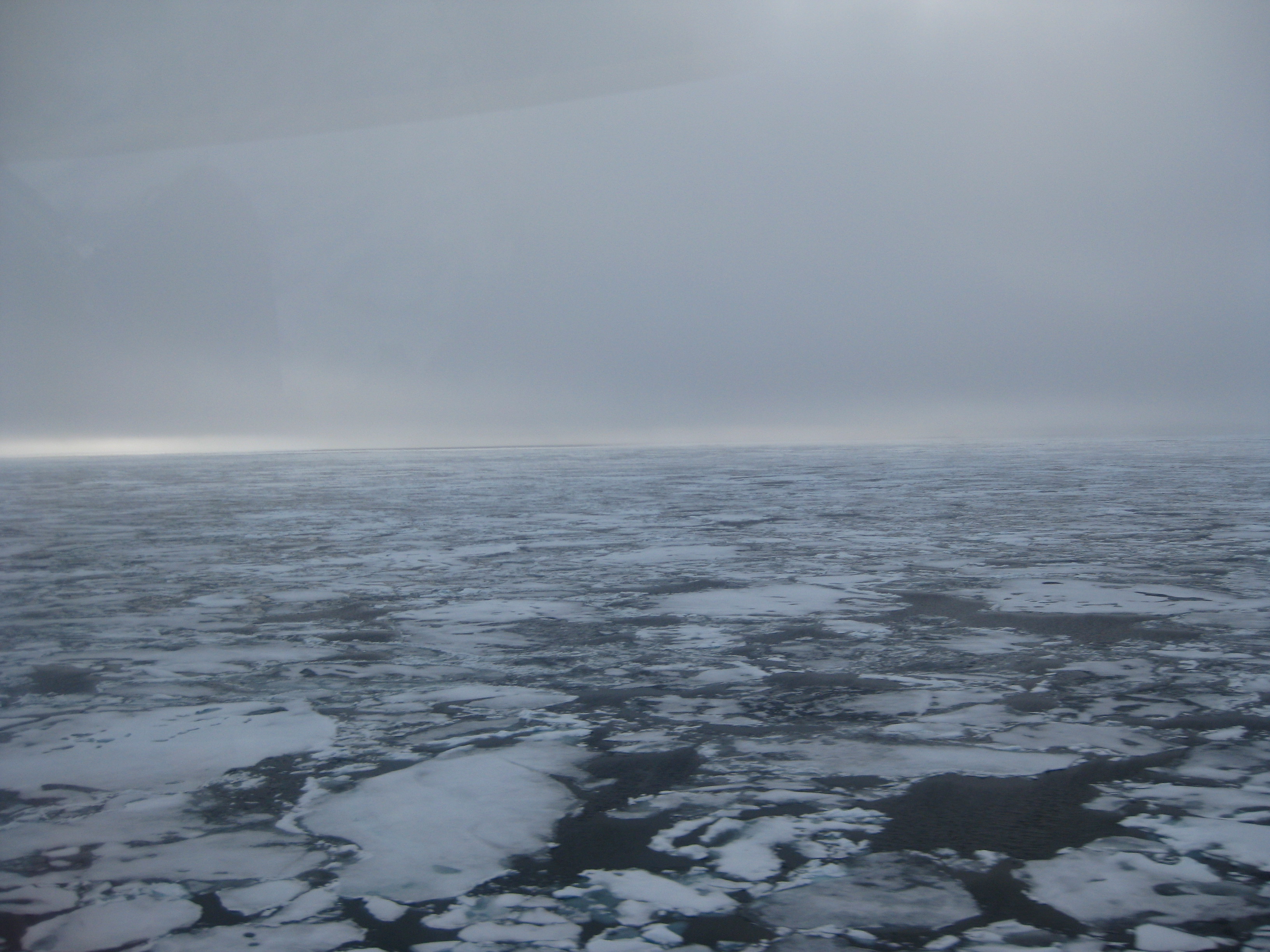 Fog over the sea ice. Flying in the helicopter over the Beaufort Sea.