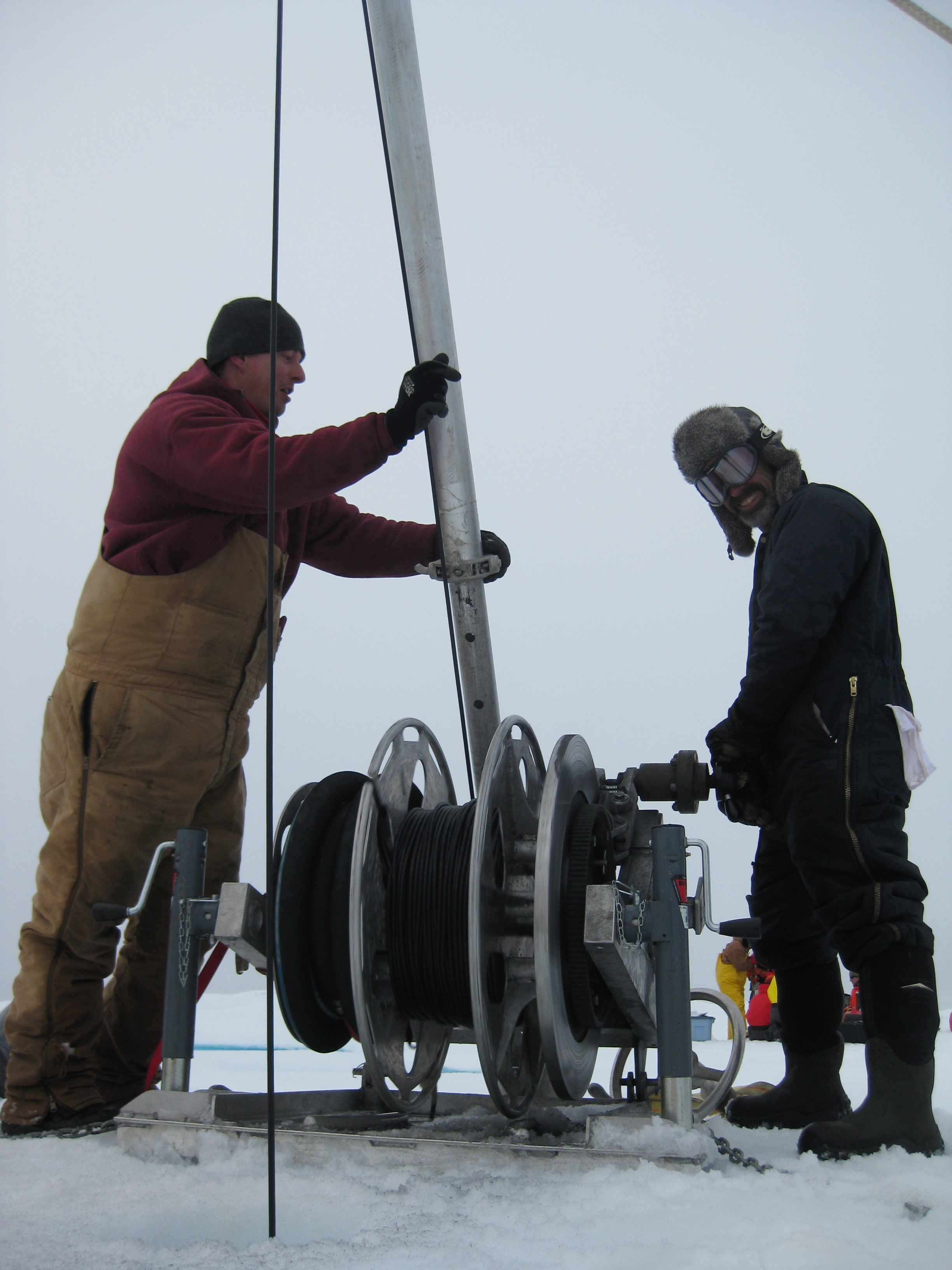 WHOI deployed an ITP (Ice-Tethered Profiler) as part of the IBO (Ice-Based Observatory). Jim (left) and Will monitor the winch as it pulls the line into the water under the ice. On the sea ice near the Canadian Coast Guard icebreaker Louis S. St-Laurent, on the Beaufort Sea.