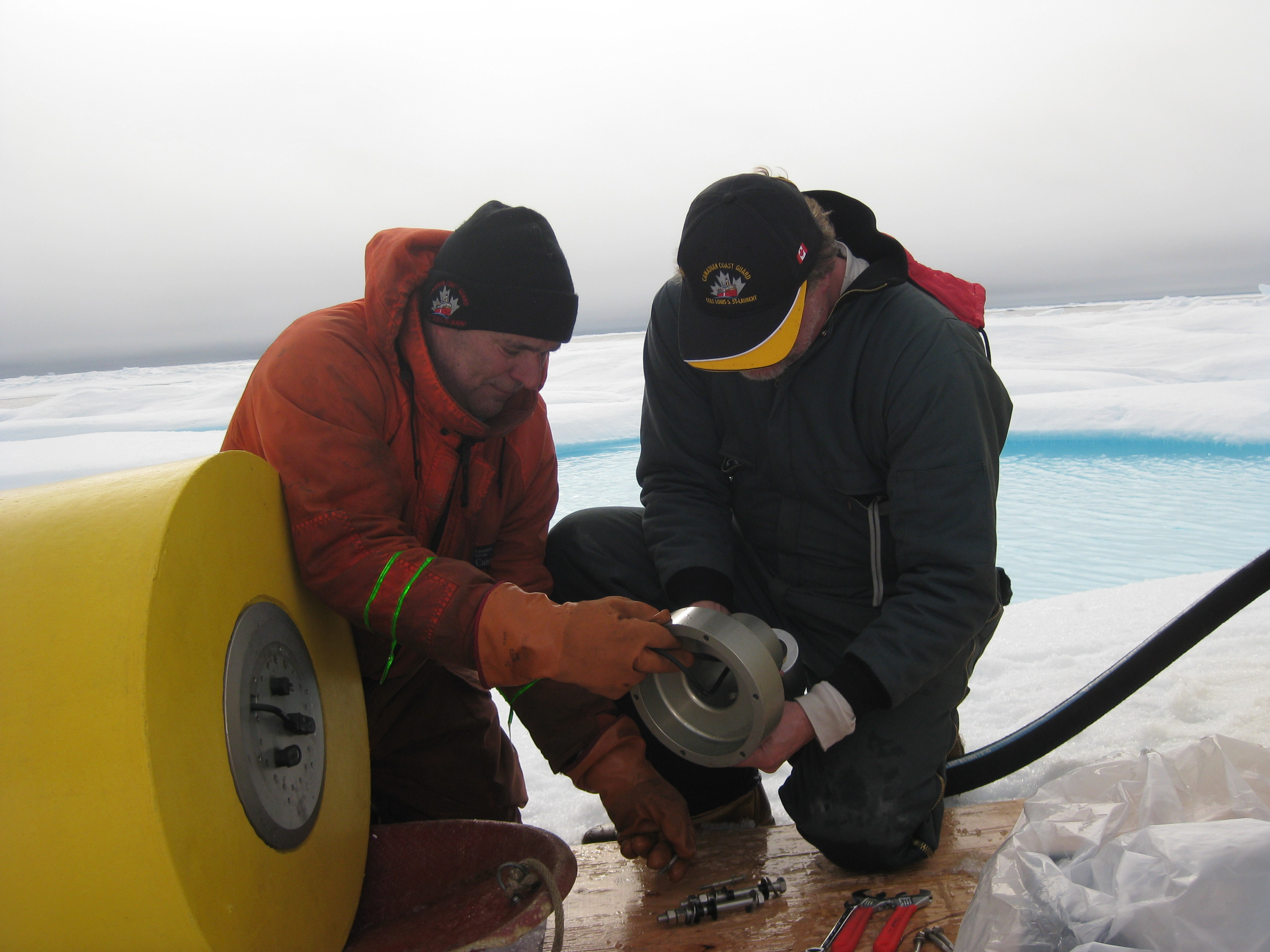 Gary Morgan and Rick Krishfield connect the wire to the buoy in the final stages of ITP (Ice-Tethered Profiler) deployment. On the sea ice near the Canadian Coast Guard icebreaker Louis S. St-Laurent, on the Beaufort Sea.