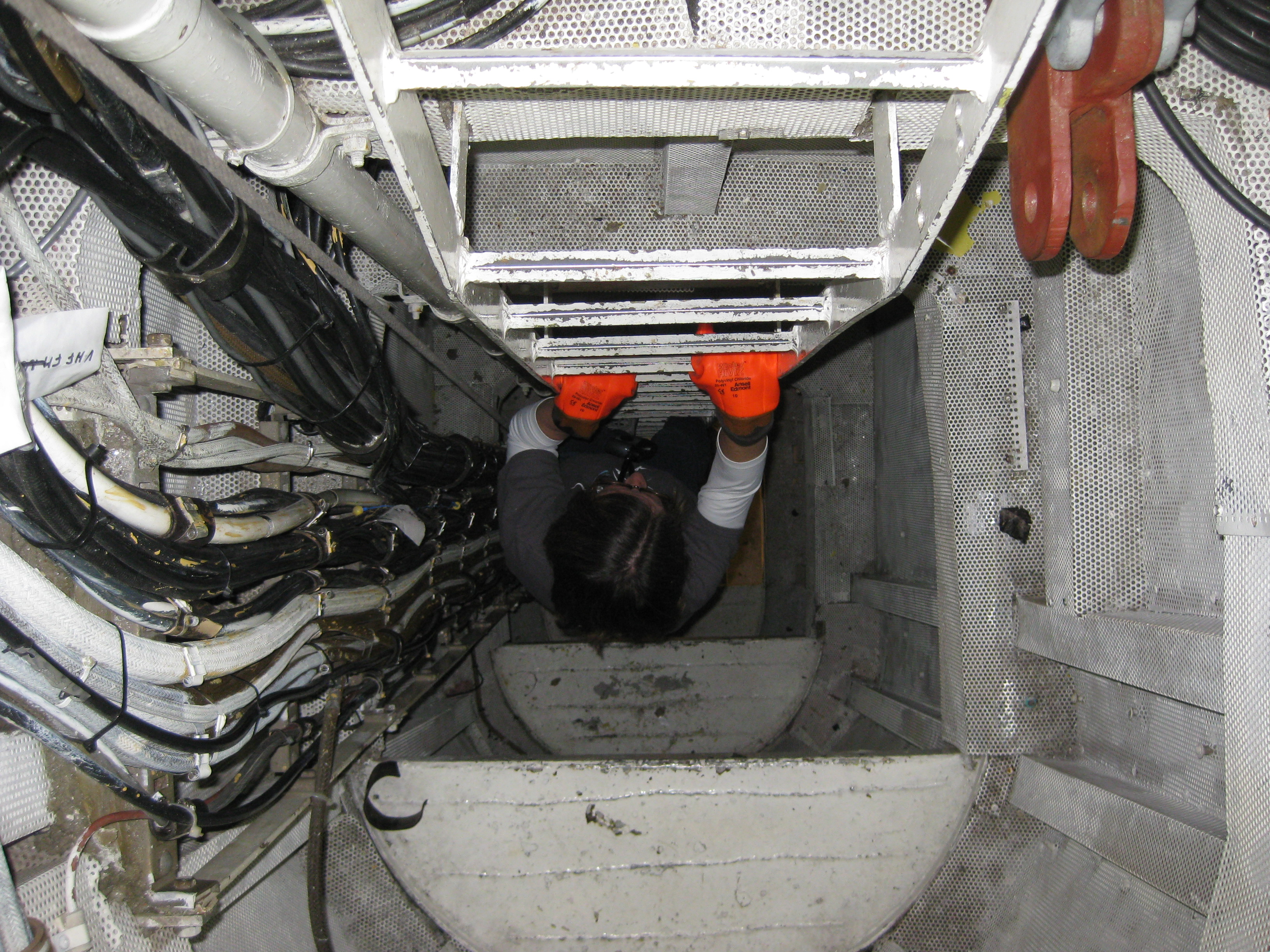 Gerty Ward says, "I am about half way down. Gloves are needed to keep a good hold on the ladder." Aboard the Canadian Coast Guard icebreaker Louis S. St-Laurent, on the Beaufort Sea.