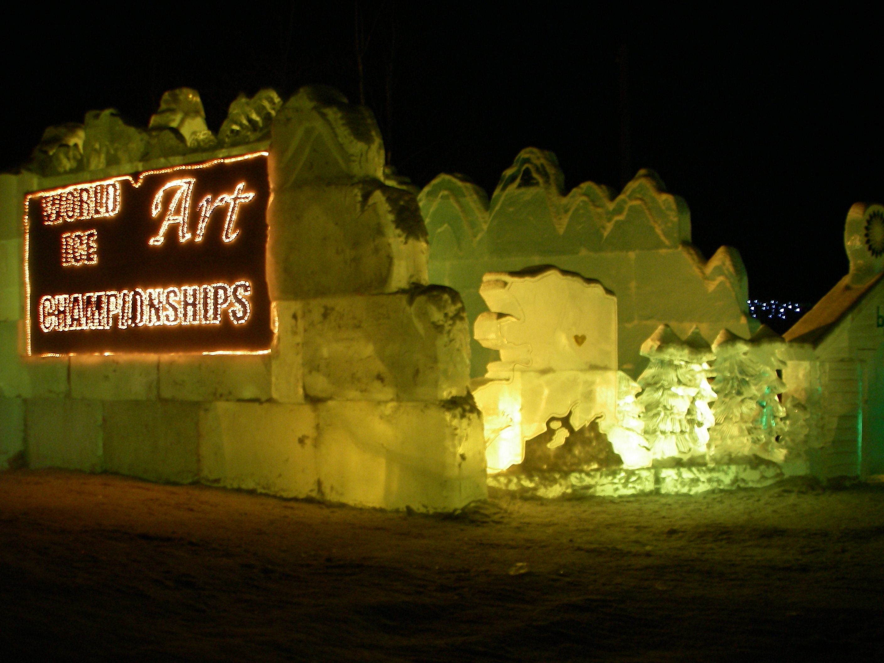 The intricately carved and brightly lighted entry to the World Ice Art Championships in Fairbanks, Alaska.