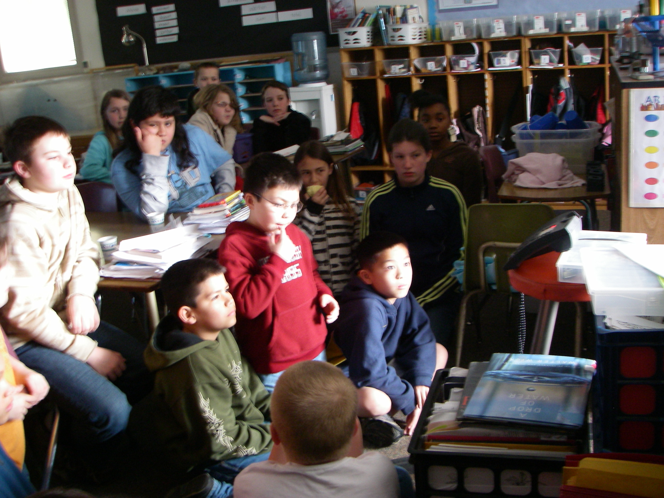 Barney Peterson's class gathered around the only speaker phone available to listen to Tim Martin talk to them from Lake E in Siberia. James Monroe Elementary School, Everett, Washington.