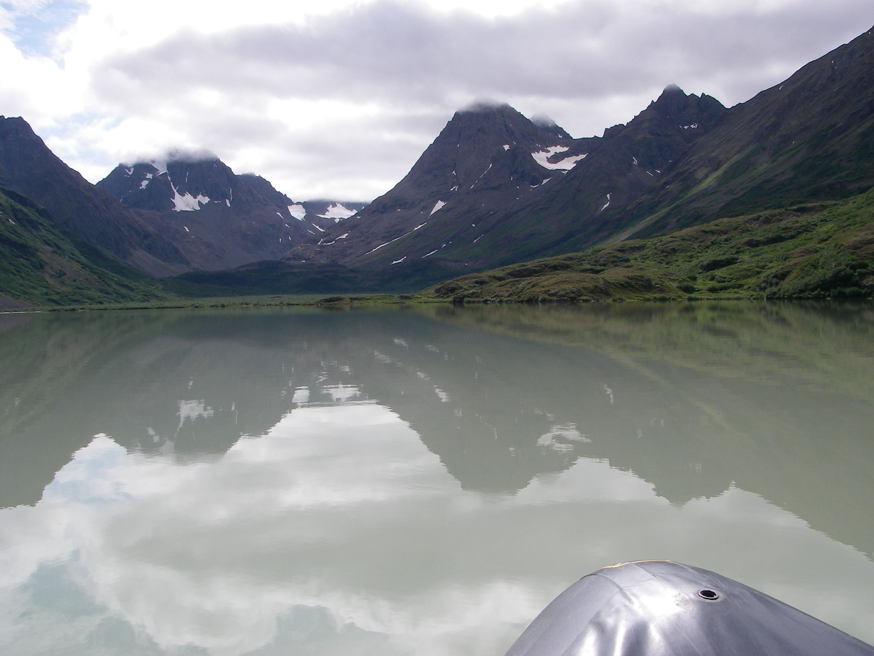 A beautiful reflected view of the main Cascade Glacier at the head of the valley above the lake, as seen from the Zodiac. Cascade Lake, Alaska.