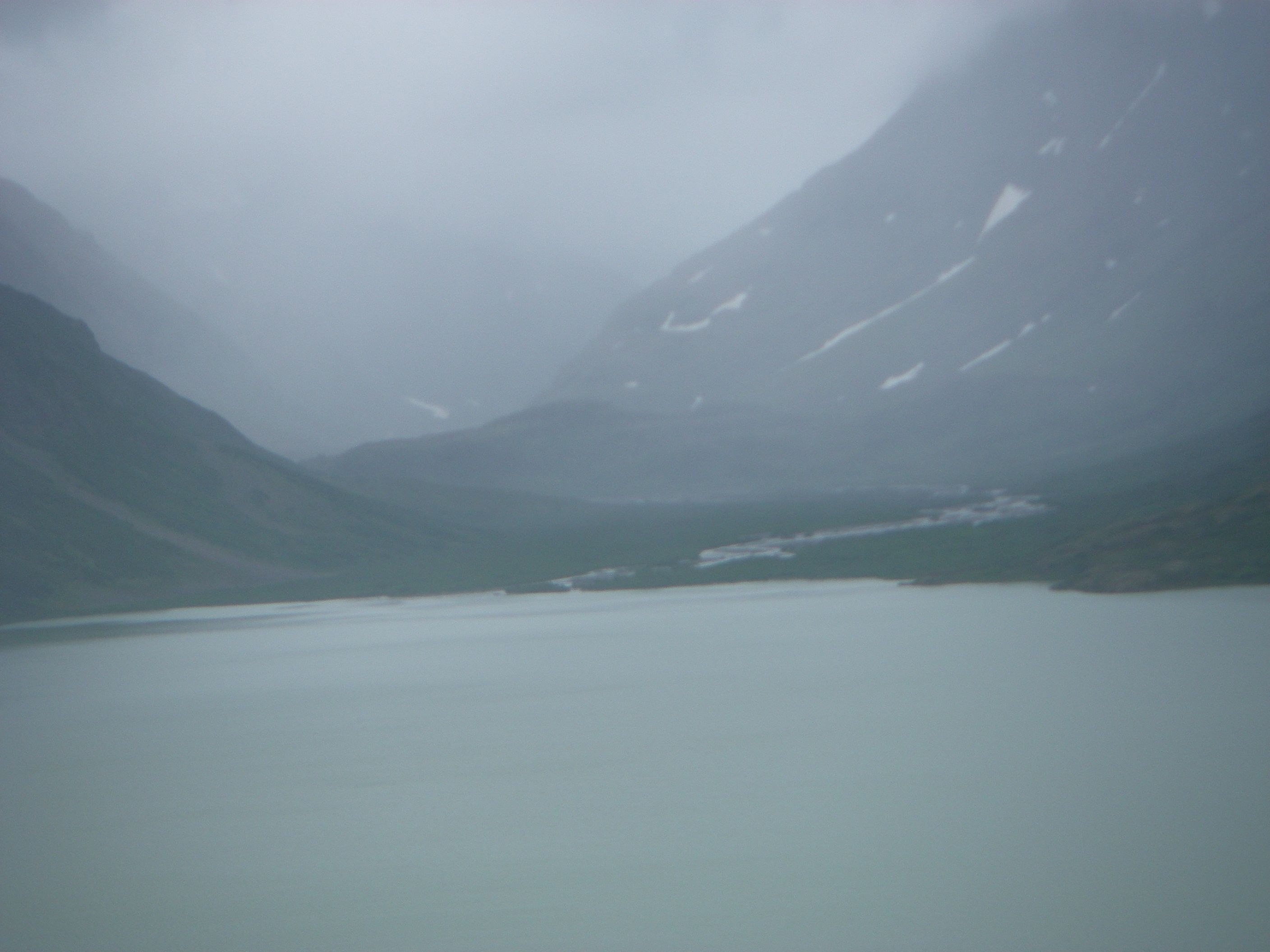Looking up towards the glacier end of the lake, all there was to see were low clouds and drizzle for much of the time the team was at Cascade Lake, Alaska.