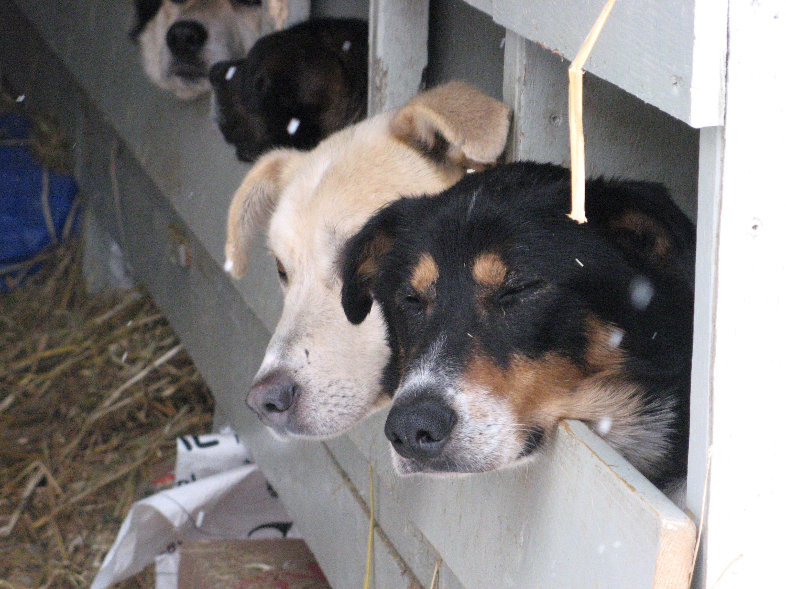 Perfectly content dogs from the North Star Kennel rest in a truck while resting in between the Yukon Quest and Iditarod. In the parking lot at the Westmark Hotel in Fairbanks, Alaska.