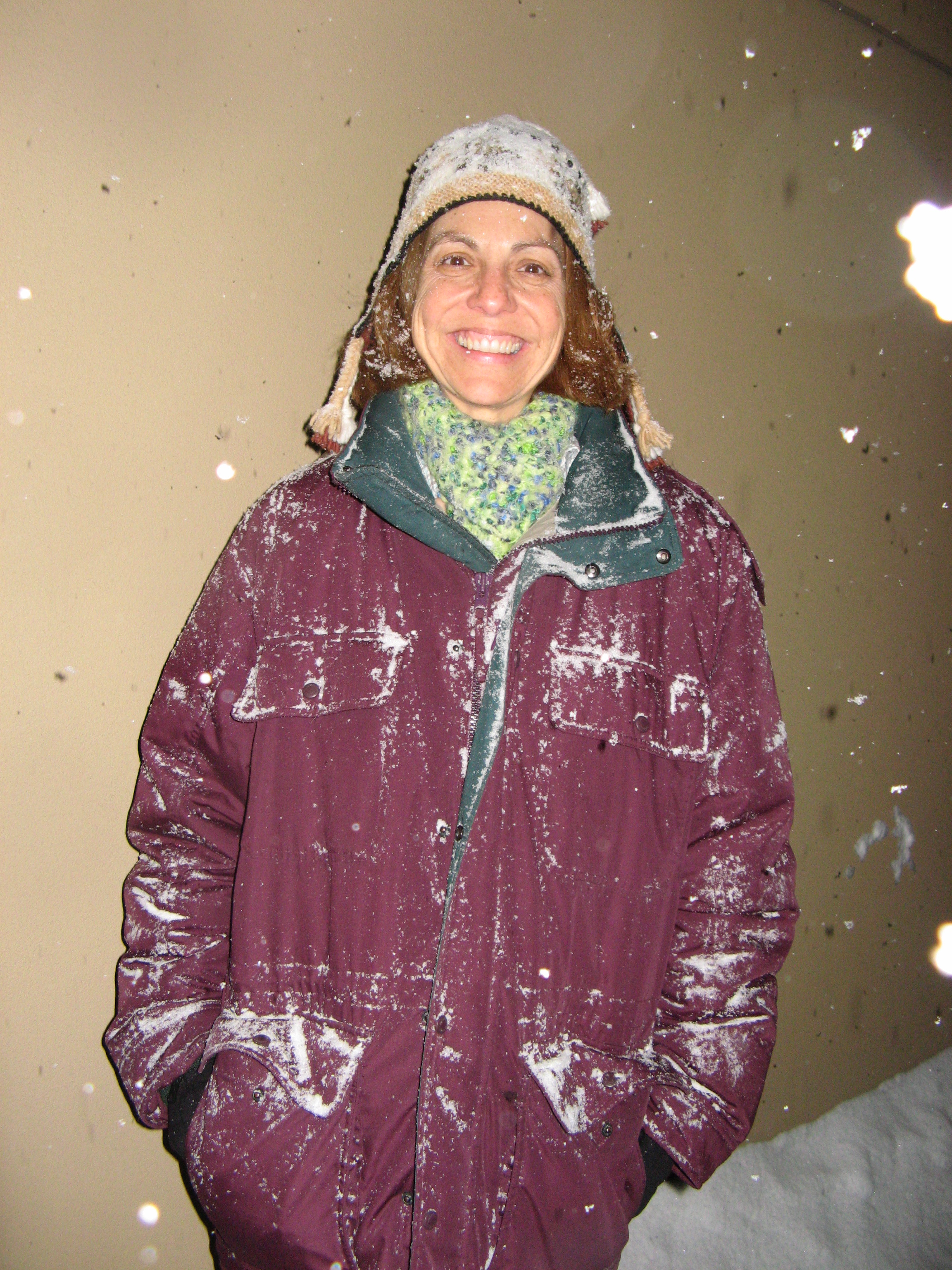 Betsy Wilkening covered in snow outside the Westmark Hotel Fairbanks, Alaska.