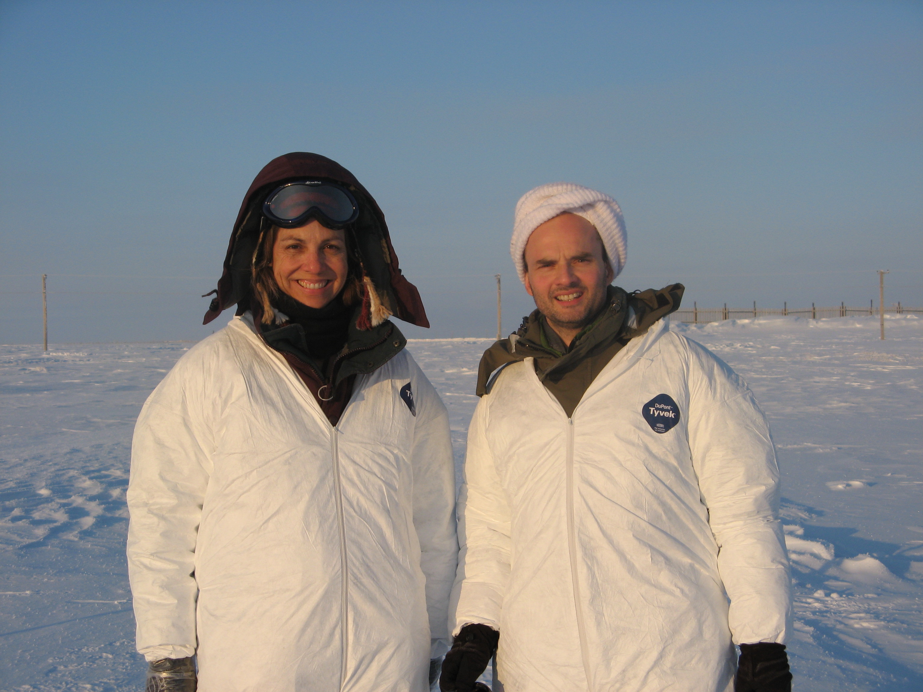 Betsy Wilkening and Harry Beine are outfitted in Tyvek suits in preparation for sampling snow. Barrow, Alaska.