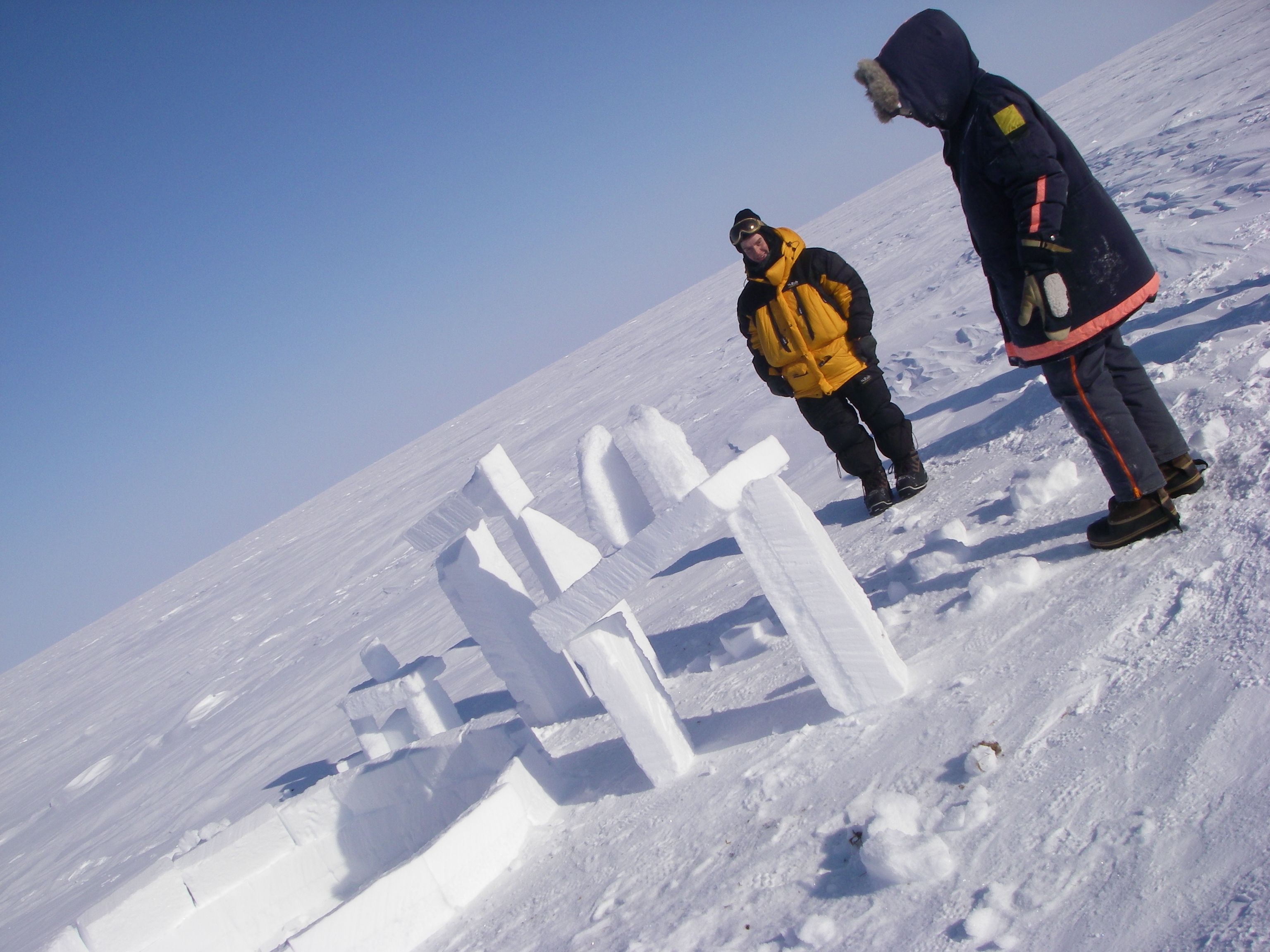Holgar Sihler and James France admire their snow construction. On the frozen tundra eight miles from the Barrow Arctic Research Center (BARC) in Barrow, Alaska.