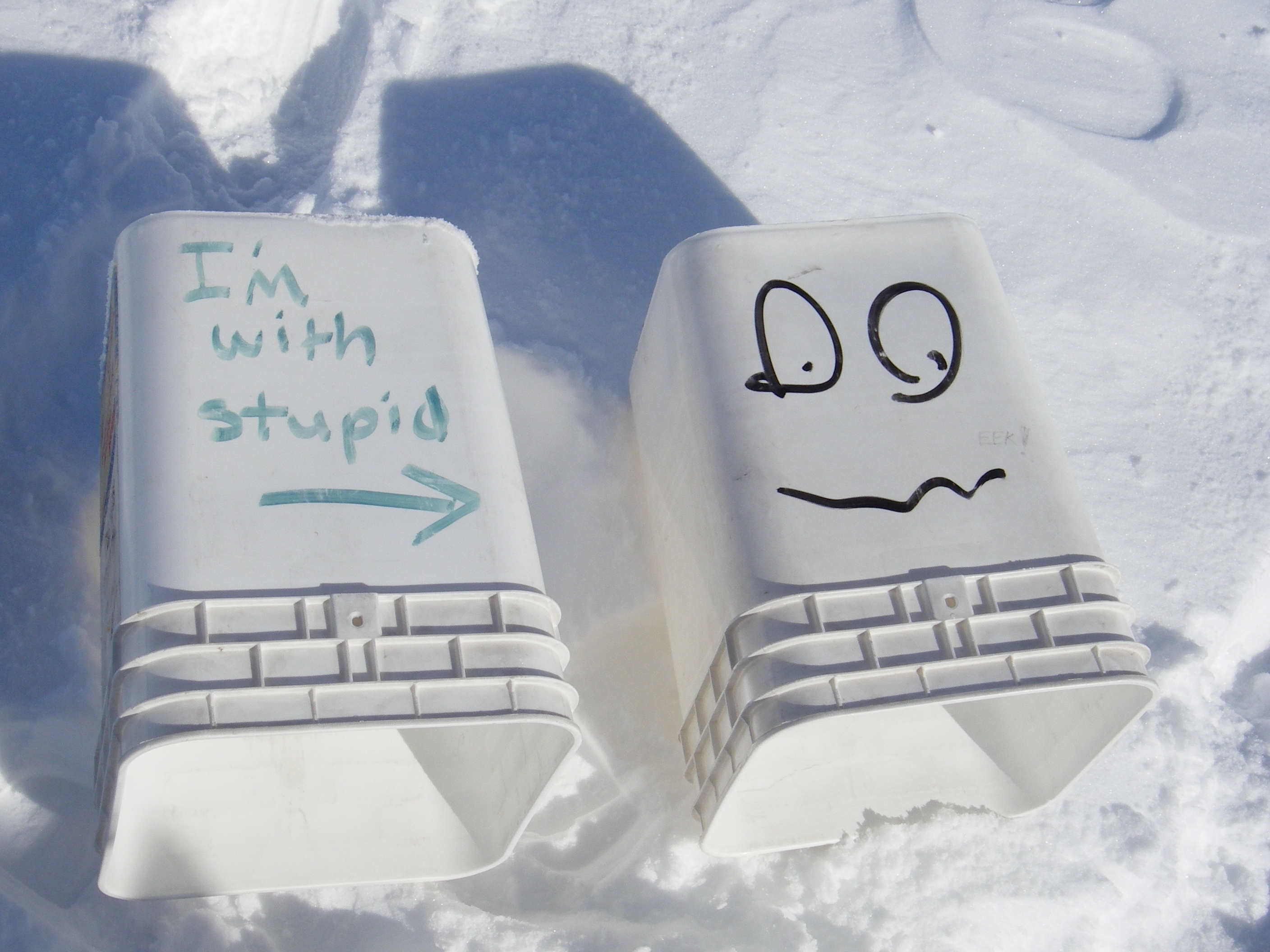 Survival scenario: lost teammate in whiteout conditions, the bucket-head activity. A bucket on your head simulates what you can see in whiteout conditions. At the Happy Camper School near McMurdo Station, Antarctica.