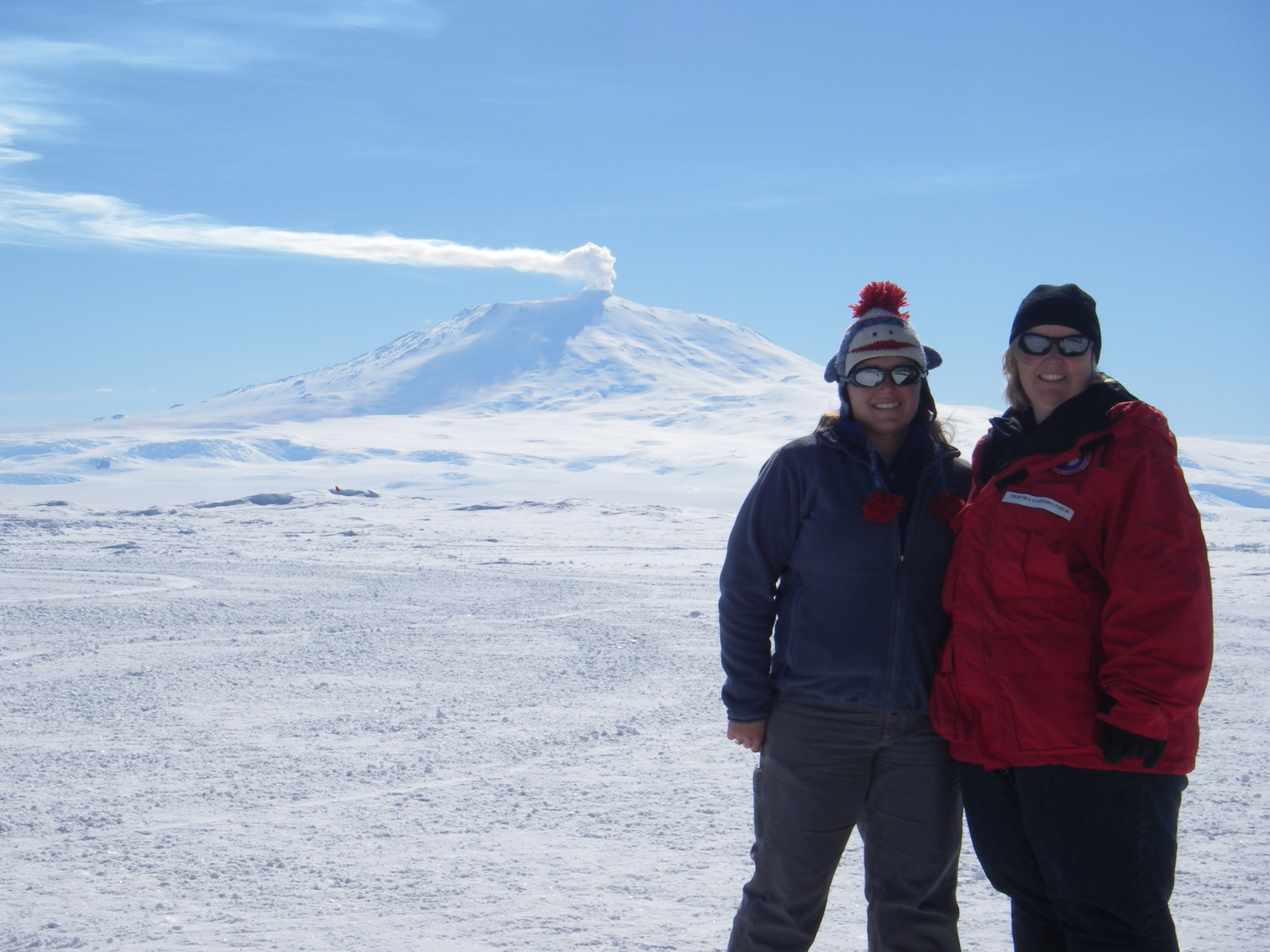 Debbie and Sarah Diers at the Long Duration Balloon Site with Mount Erebus in the background. Long Duration Balloon Site, Antarctica.