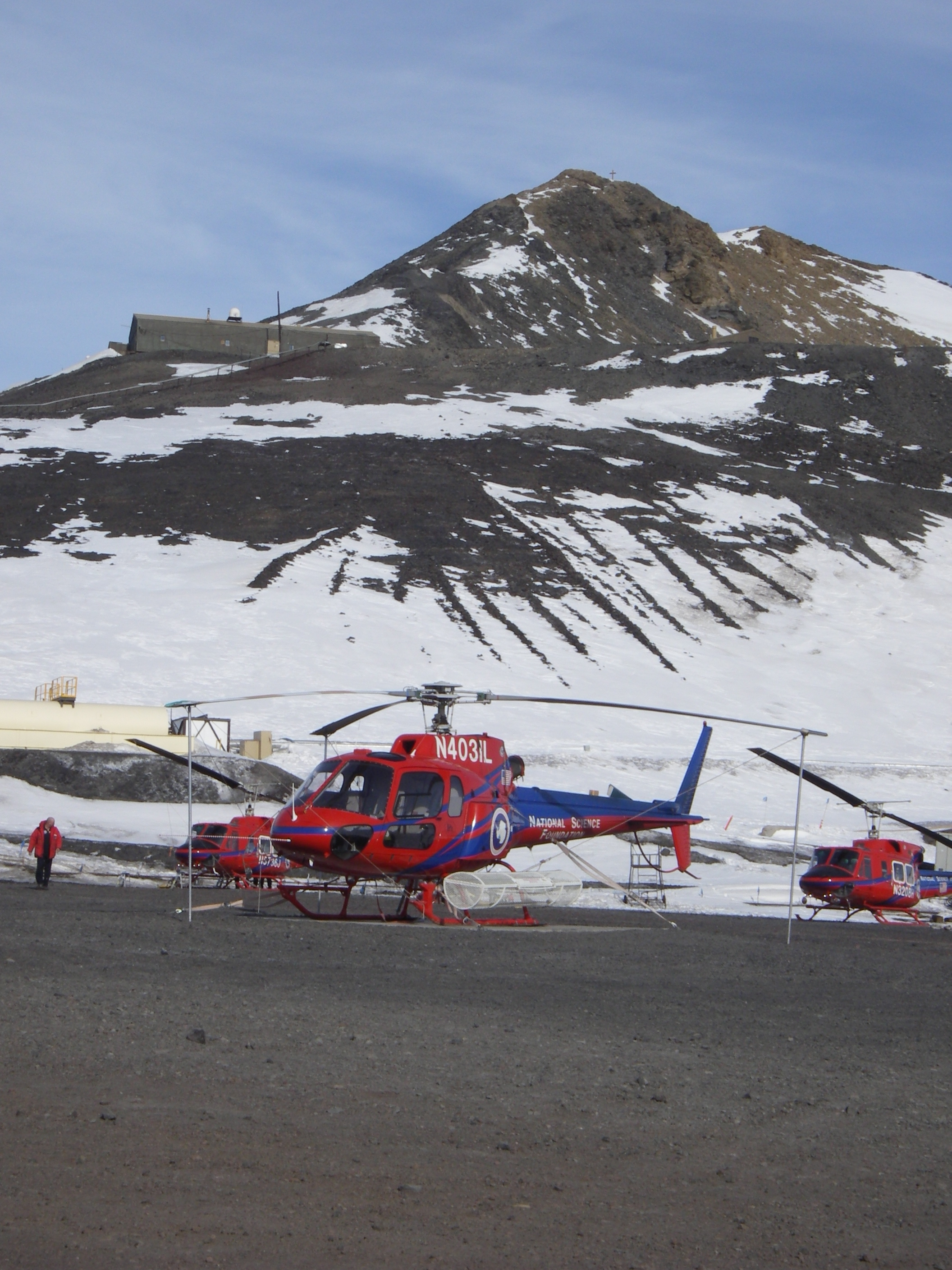 Sarah Diers: "Helicopters travel long distances, carry a good amount of equipment, and are able to touch down at sites planes cannot." McMurdo Station, Antarctica.