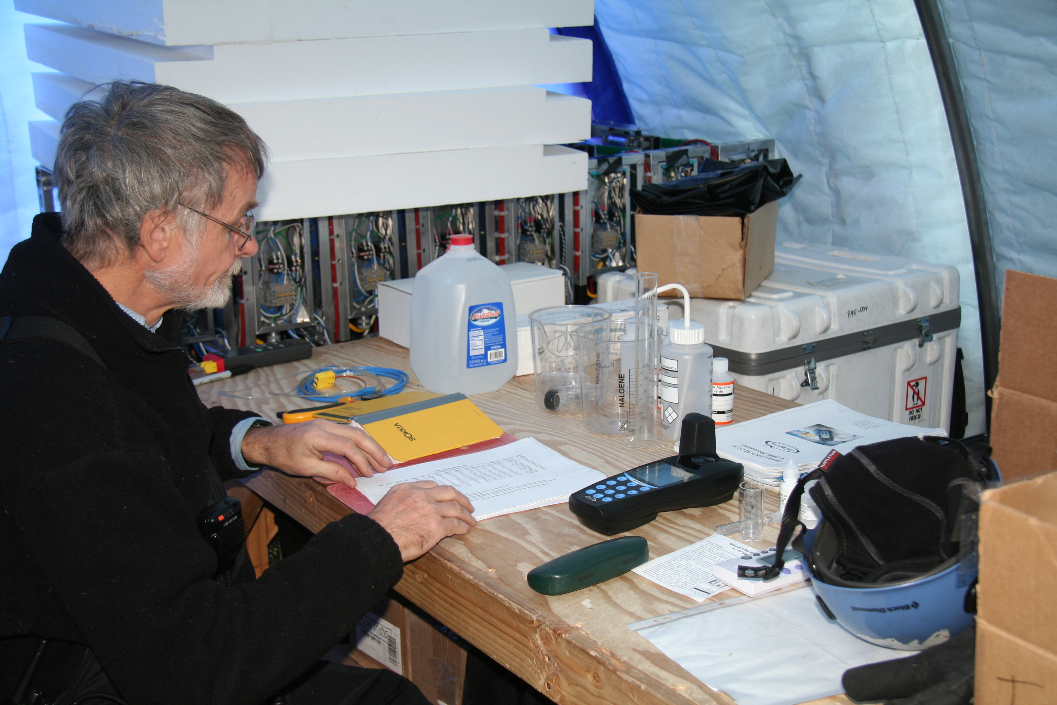 Dr. Hermann Kolanoski samples and tests the water that will be used to fill the IceTop tanks. Often it gets contaminated with glycol (antifreeze) or other chemicals, which can interfere with the freezing process. Near the Amundsen-Scott South Pole Station, Antarctica.