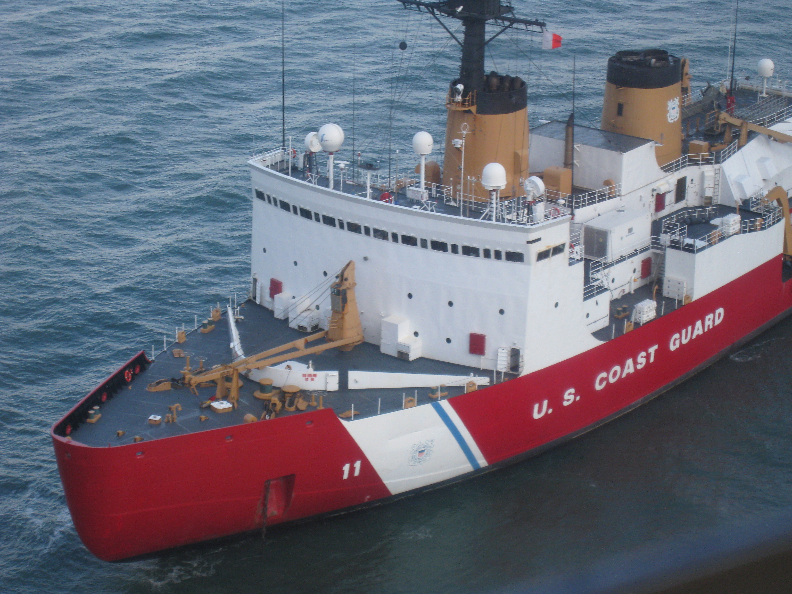 The USCGC Polar Sea icebreaker comes into view from the window of the helicopter. Barrow, Alaska.