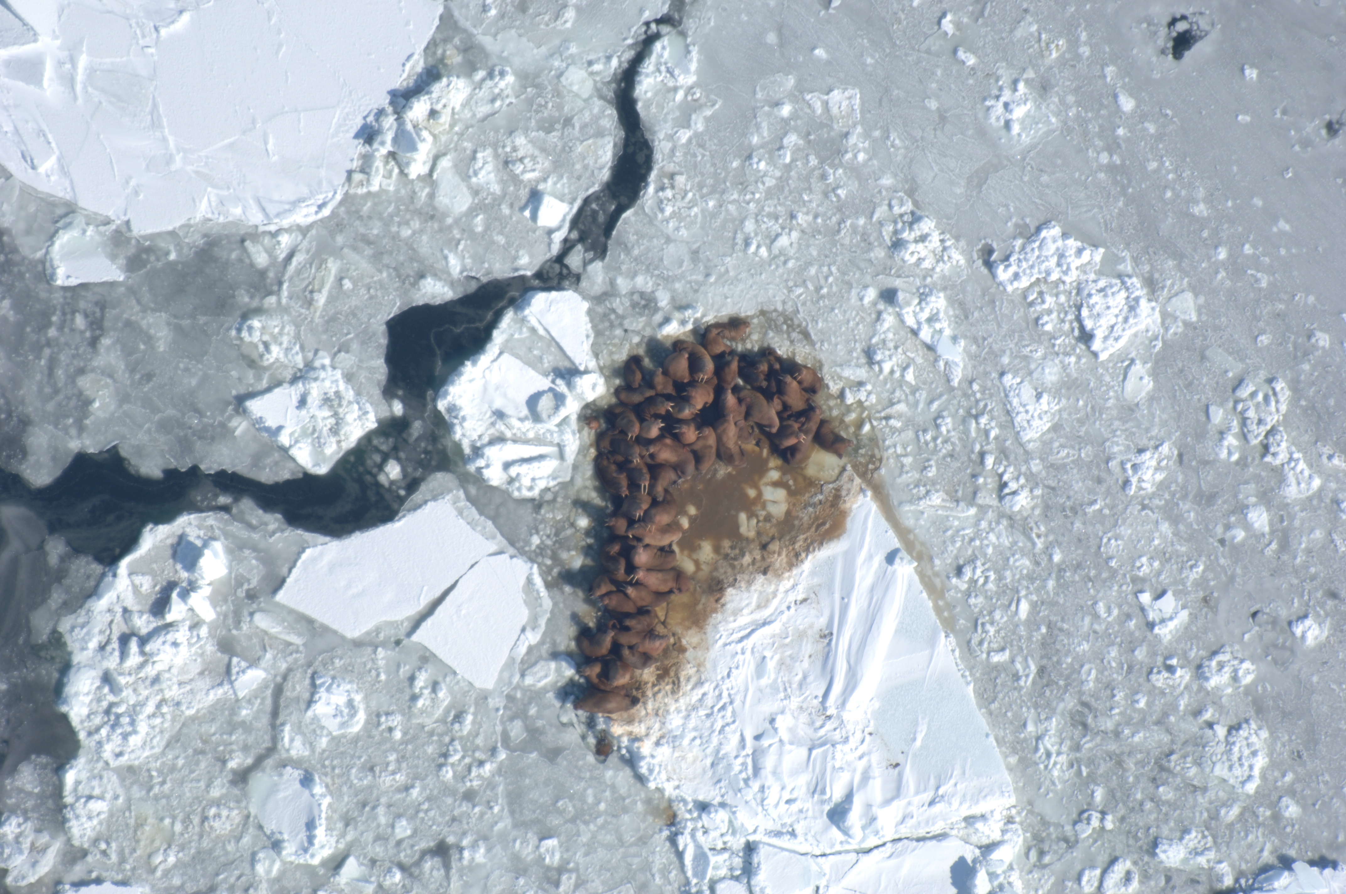 Walrus (*Odobenus rosmarus*) hauled out on the ice of the Bering Sea, seen during the April 2006 US Fish and Wildlife Service (USFWS) Walrus Survey.