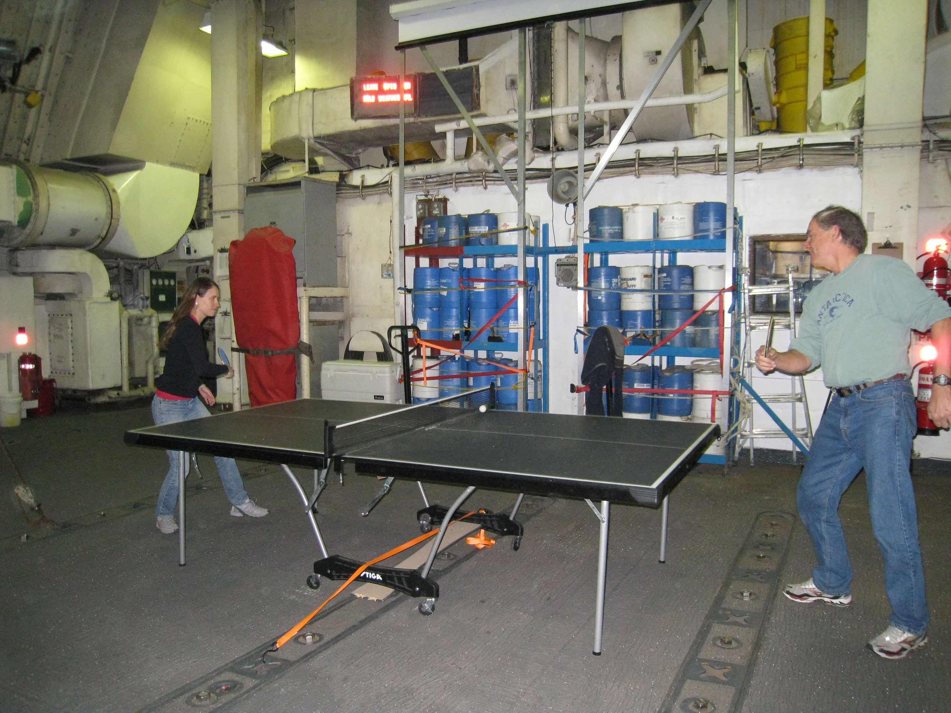 Cristina Galvan: "Alex and Greg play a serious game of ping-pong in the hanger." Aboard the USCGC Polar Sea icebreaker in the Beaufort Sea.