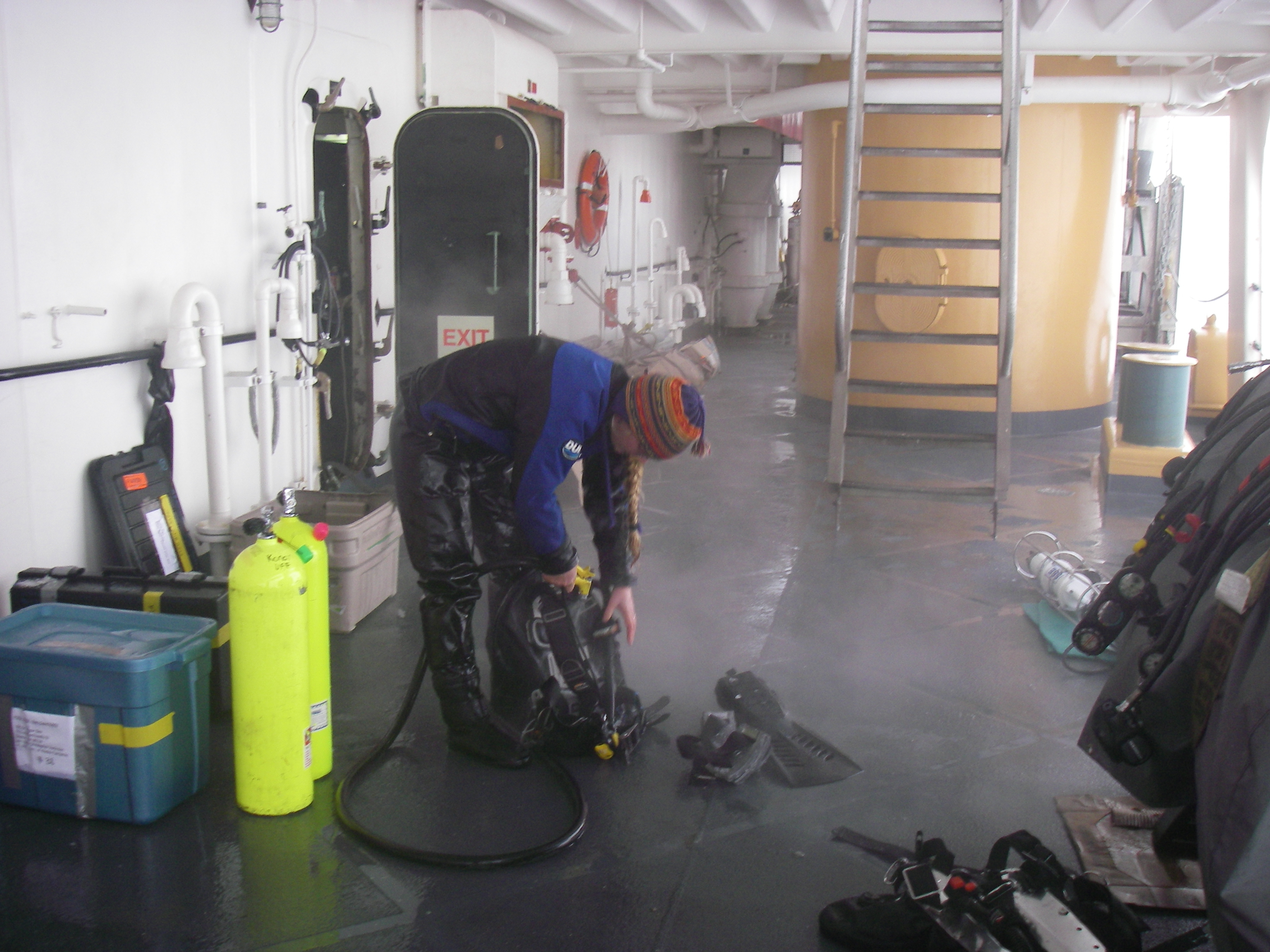 Katrin cleans off the gear after the dive. Aboard the USCGC Polar Sea icebreaker in the Beaufort Sea.