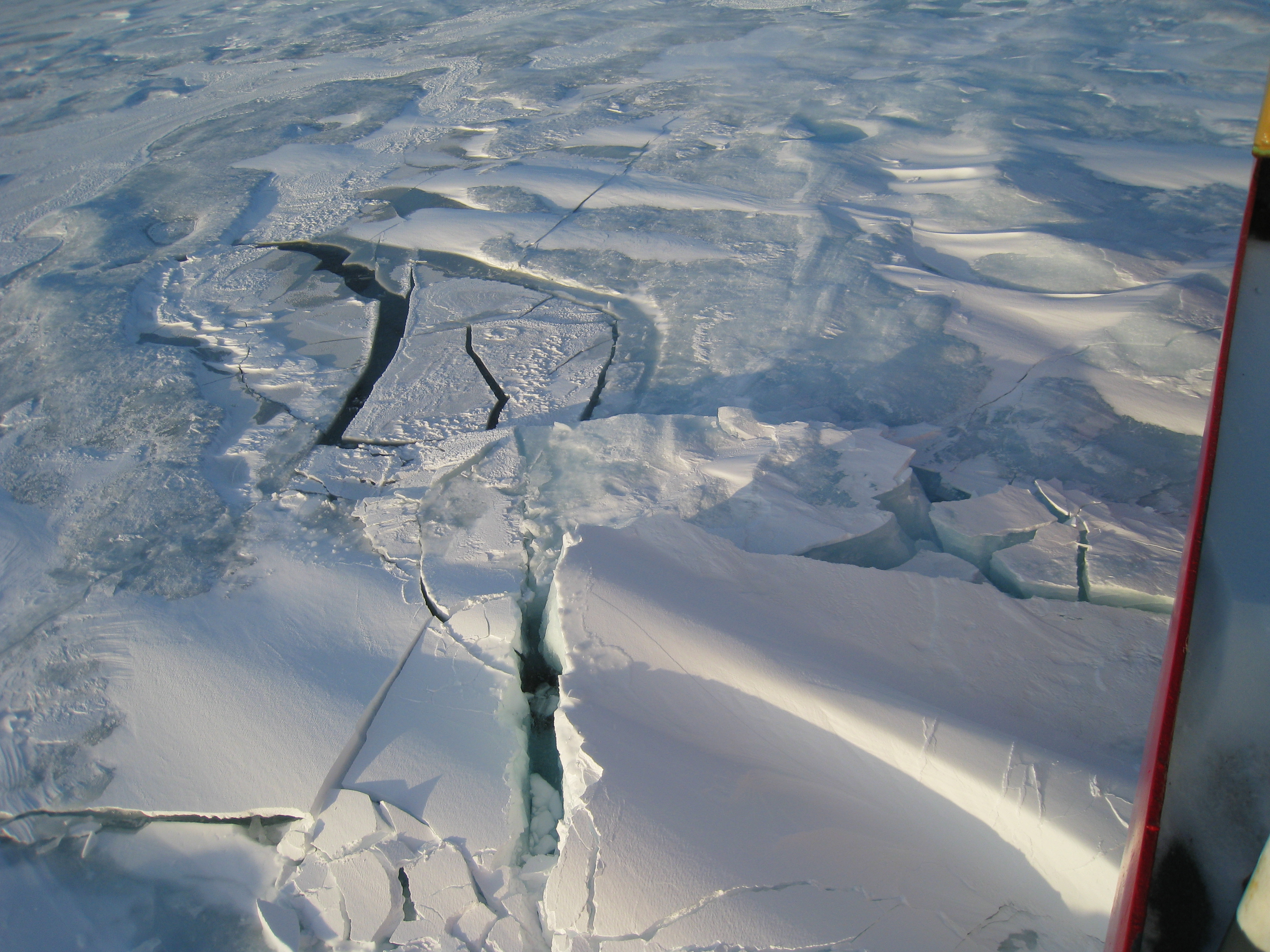 The Polar Sea cuts right though the thick sea ice. The blue color means it is multiyear ice (ice that has survived at least two summers). Aboard the USCGC Polar Sea icebreaker in the Beaufort Sea.