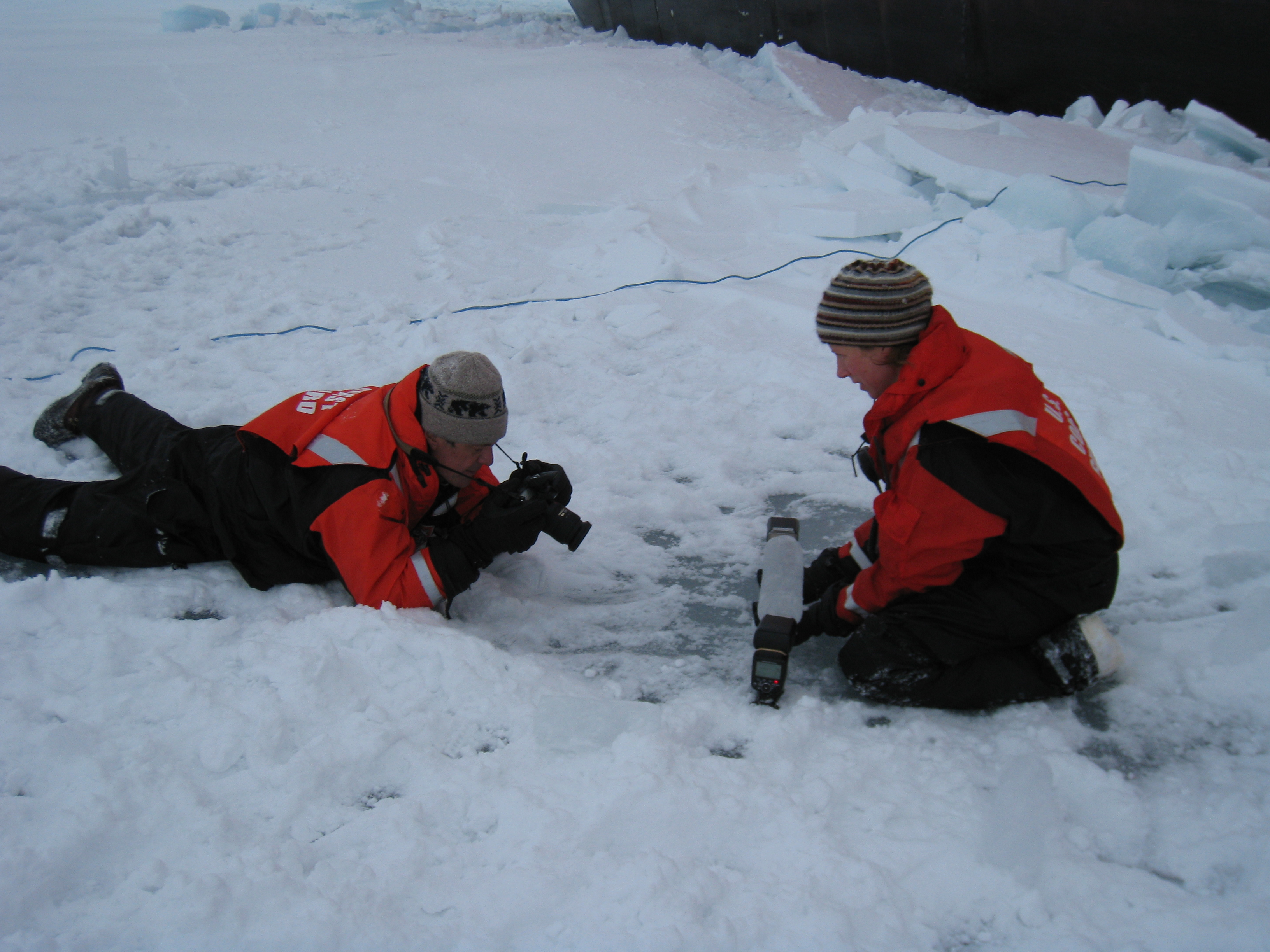 Cristina Galvan: "Dan takes photos of one of the ice cores that the team pulled up." On the sea ice, next to the USCGC Polar Sea icebreaker in the Beaufort Sea.