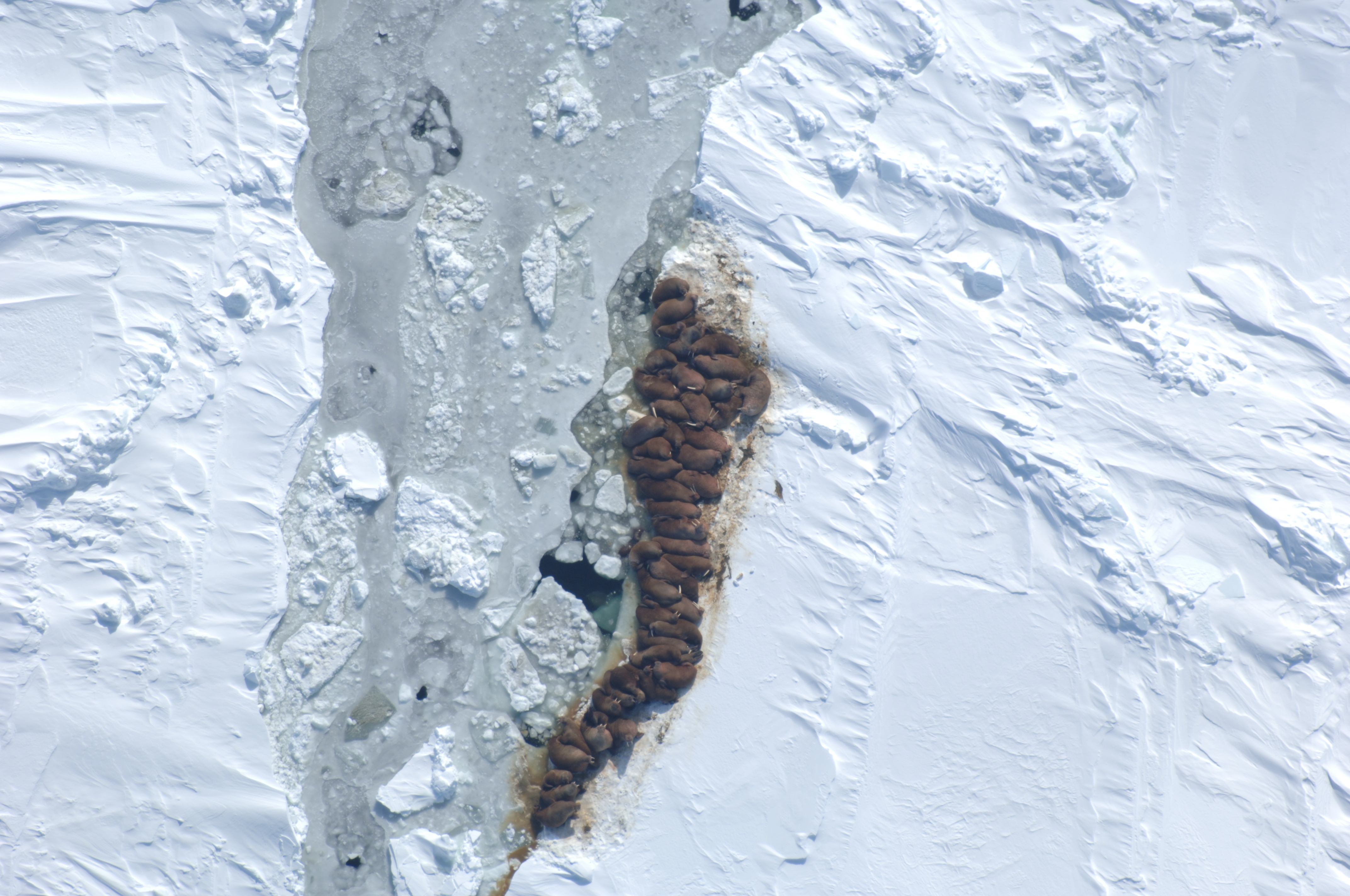 Walrus (*Odobenus rosmarus*) hauled out on the ice of the Bering Sea, seen during the April 2006 US Fish and Wildlife Service (USFWS) Walrus Survey.