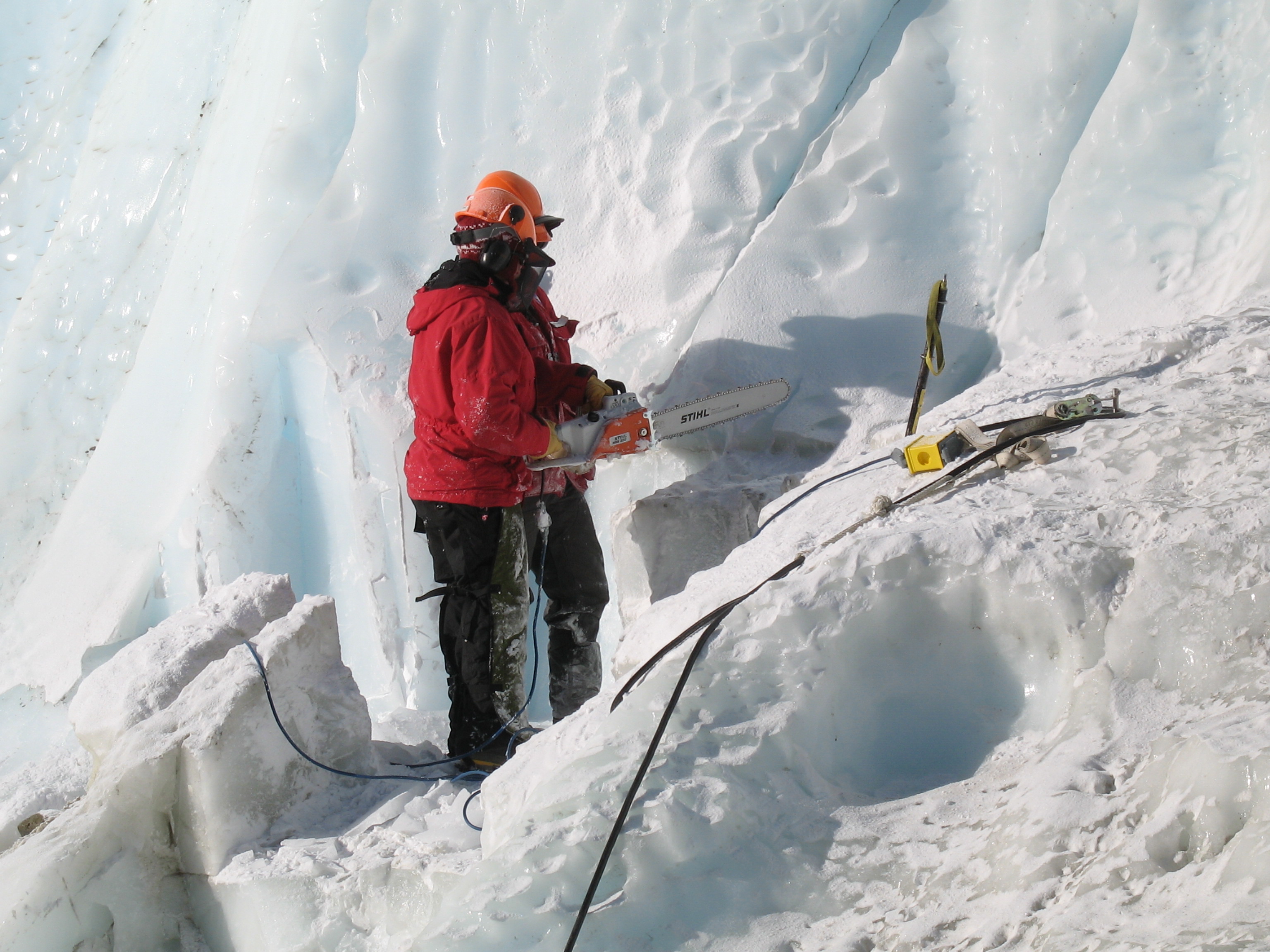 Tim Brox teaches Lindsay Knippenberg the safety and techniques of chainsawing. At Taylor Glacier in the McMurdo Dry Valleys, Antarctica.