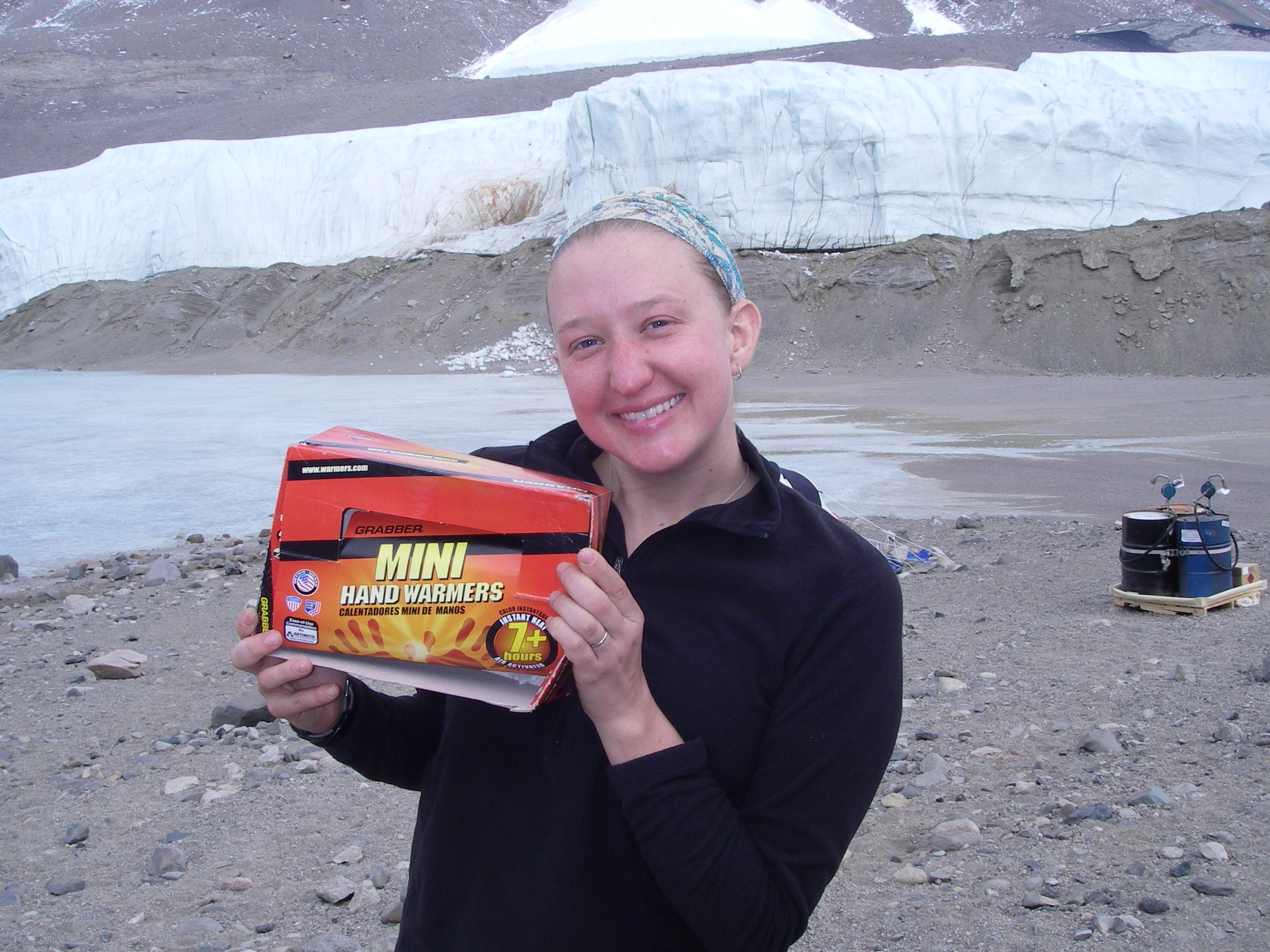 Lindsay Knippenberg: "My hand warmers keep my hands warm all day as I am handling ice at the tunnel site." At Taylor Glacier in the McMurdo Dry Valleys, Antarctica.
