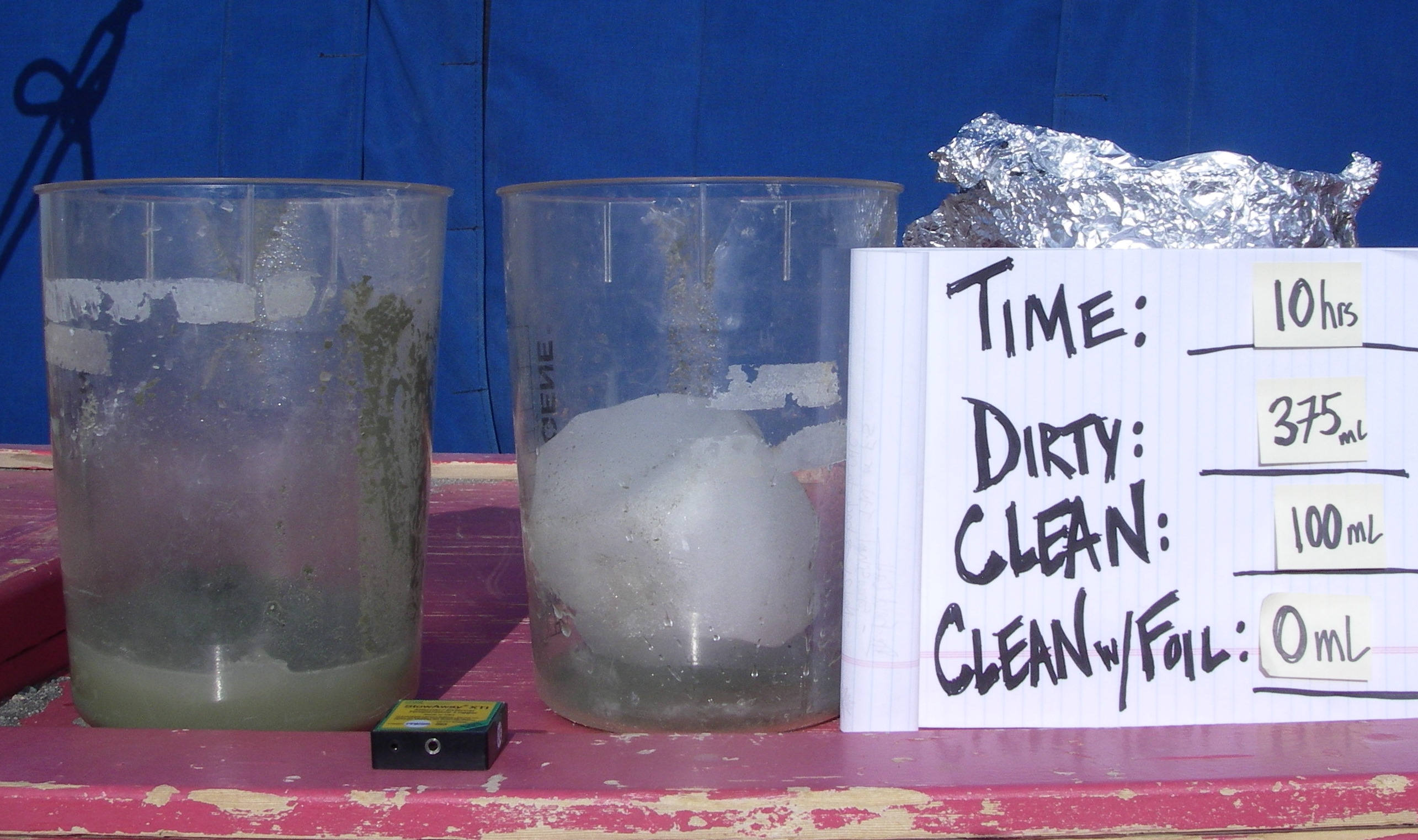 After ten hours, the dirty ice created 375mL of melt water, the clean ice created 100mL of melt water, and the clean ice with foil created 0mL of melt water. McMurdo Dry Valleys, Antarctica.