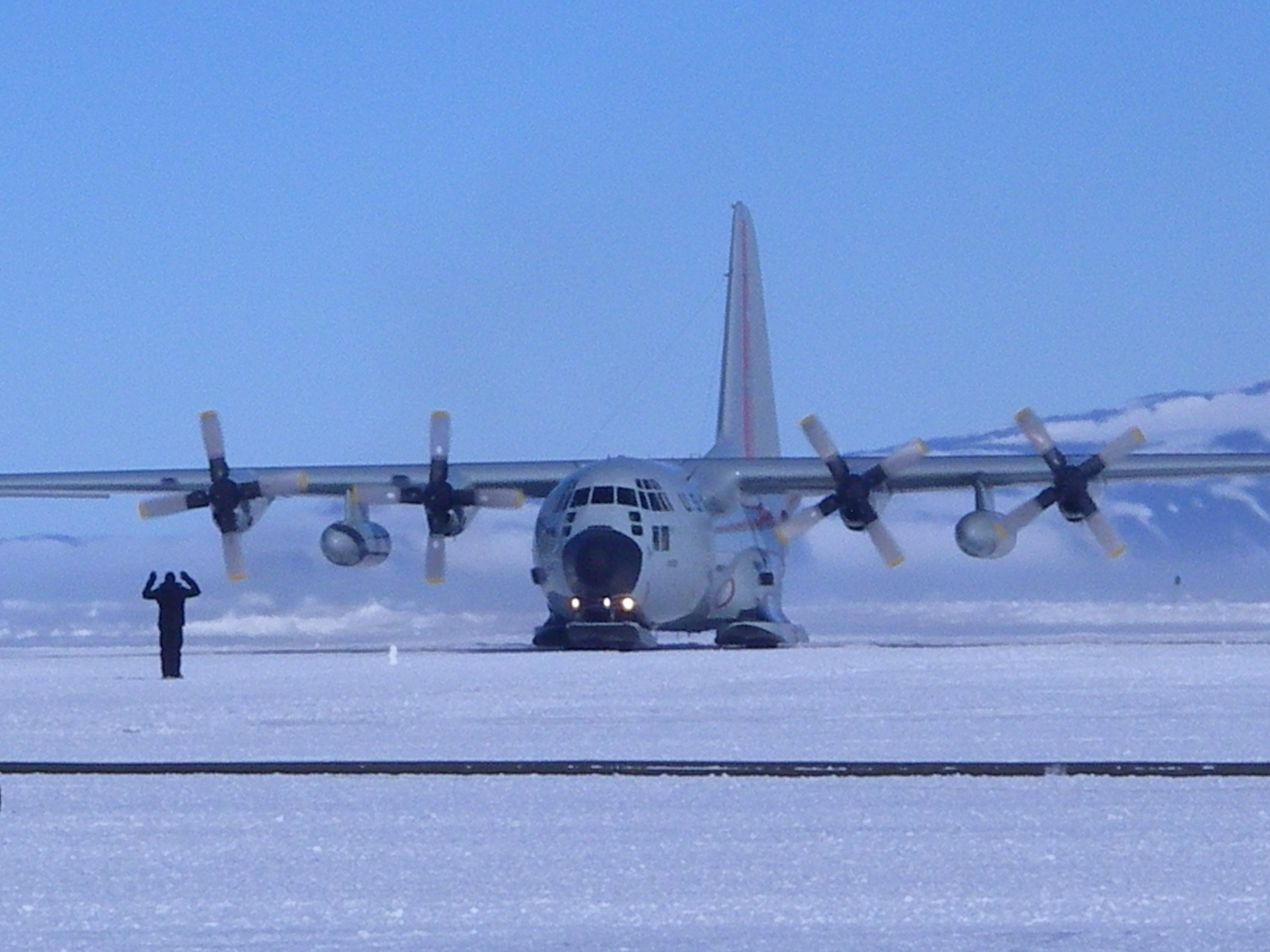 As the team waited on the runway for their plane to be ready, several Lockheed C-130 Hercules' flew in and took off. McMurdo Station, Antarctica.
