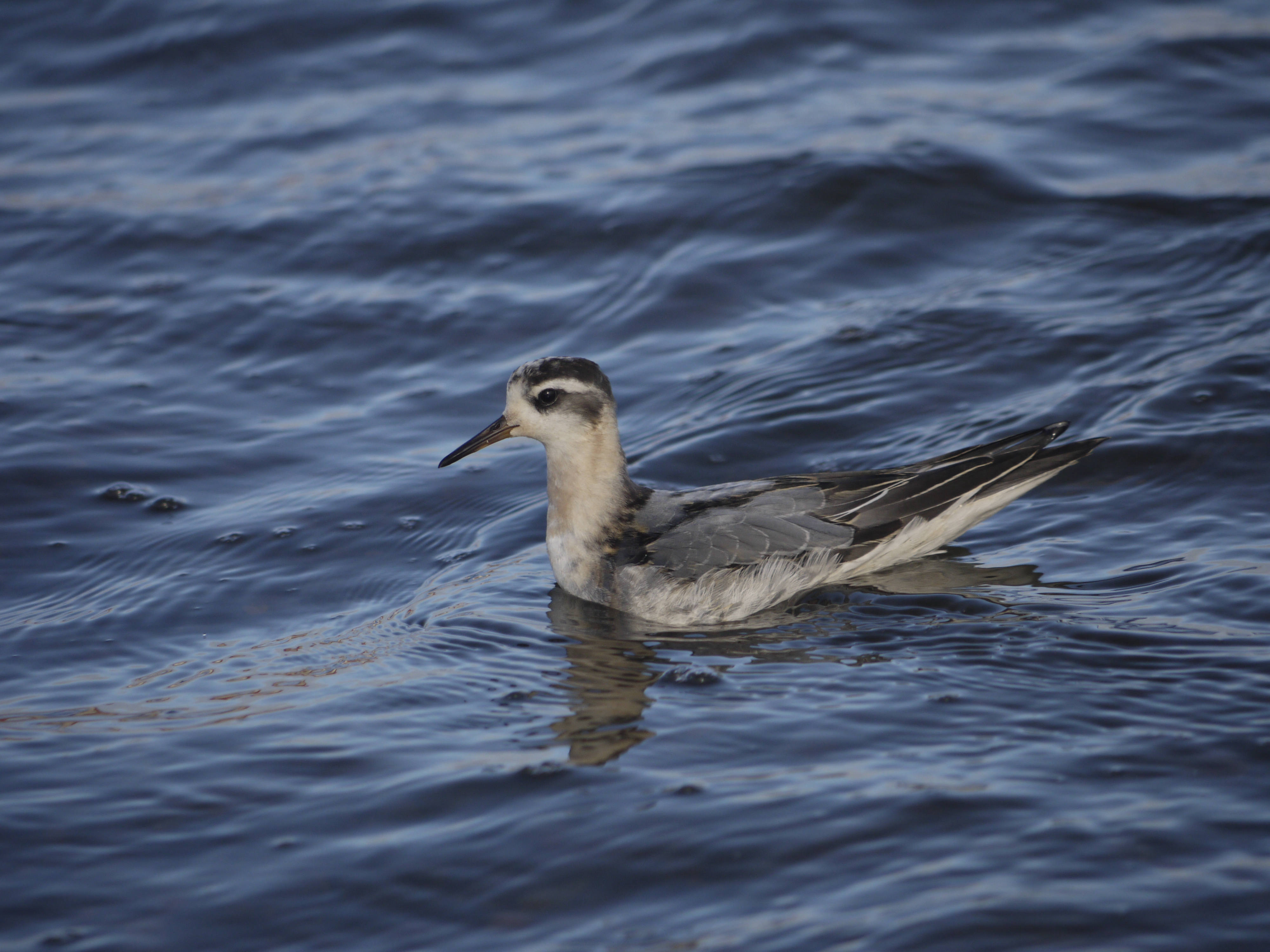 A Red Phalarope swims in a lagoon on the outskirts of Barrow, Alaska. Phalaropes are unusual in the bird world with the females much brightly colored than males. This is a male that is molting into its non-breeding plumage. Barrow, Alaska.