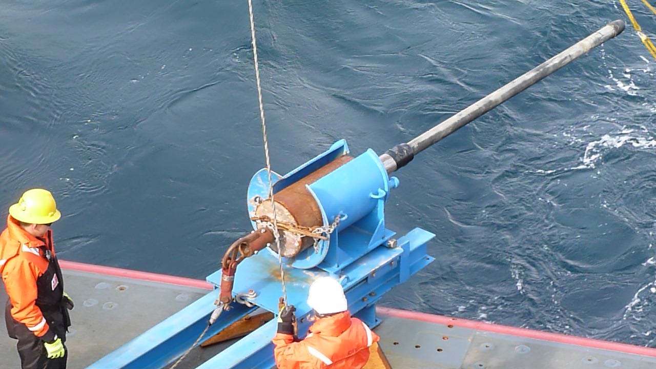 The gravity core rig on its deployment rail, ready to be tipped up and lowered overboard to the sea floor. The heavy weight on the near end weighs 2400 lbs and the 4" steel pipe is 10 feet long. Aboard the USCGC Healy icebreaker in the Beaufort Sea.