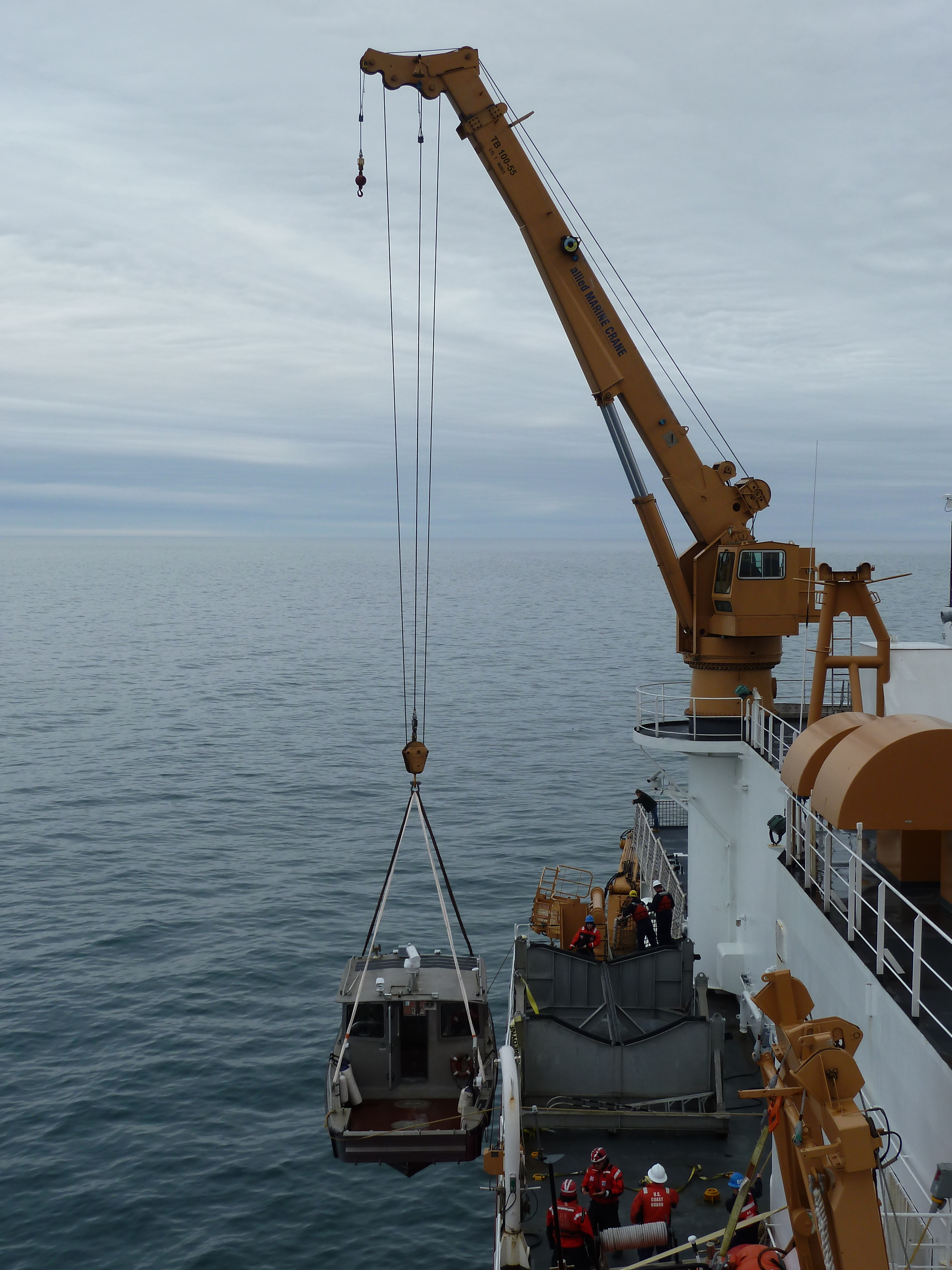 The large 04 deck starboard crane lowers the ASB (Arctic Service Boat) from its cradle into the sea. Aboard the USCGC Healy icebreaker in the Beaufort Sea.